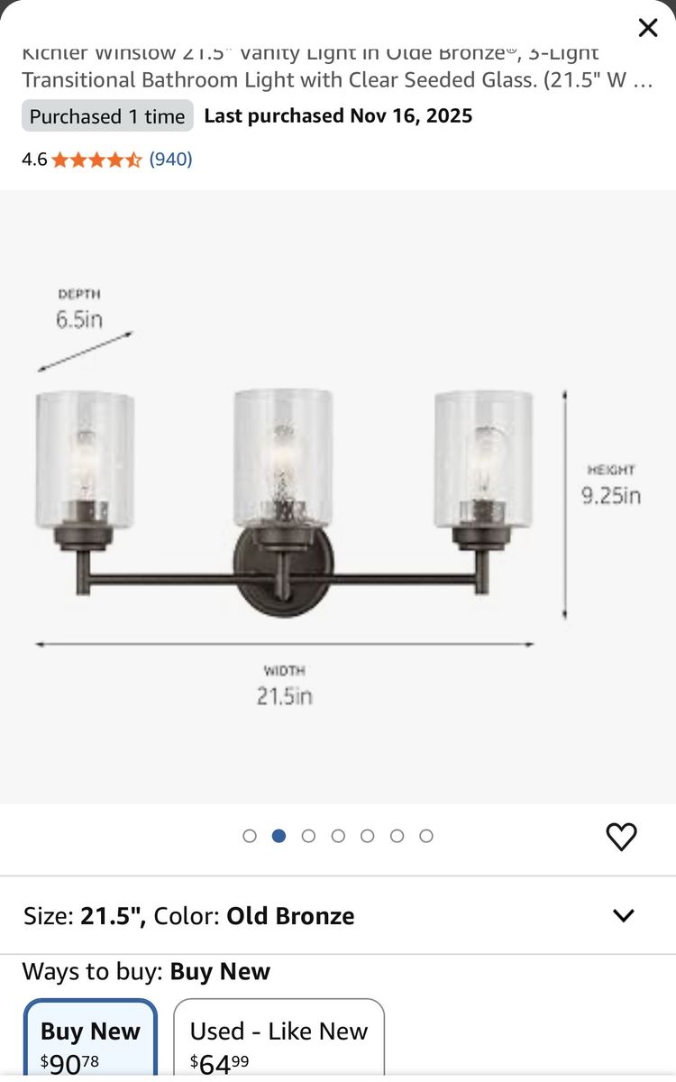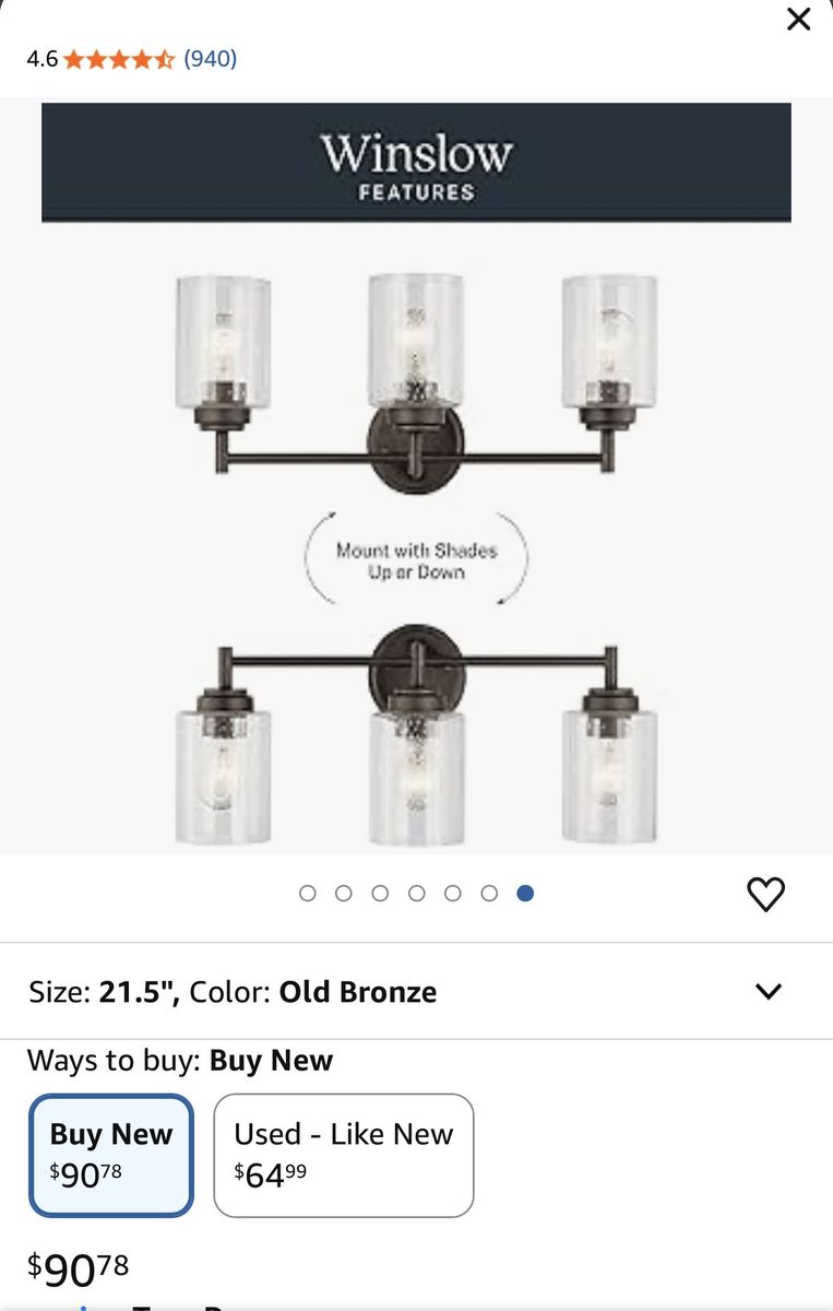 KichlerKichler Winslow 21.5" Vanity Light in Olde Bronze®, 3-Light Transitional Bathroom Light with Clear Seeded Glass. (21.5" W x Kichler Winslow 7.5" Mini Kitchen Pendant with Clear Seeded Glass in Olde Bronze®, (7.5" H x 4.25" W),