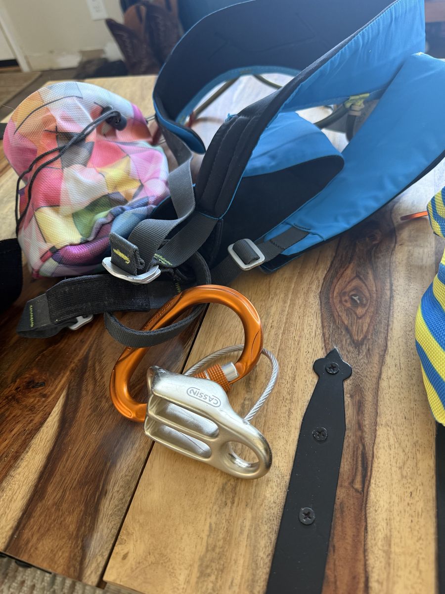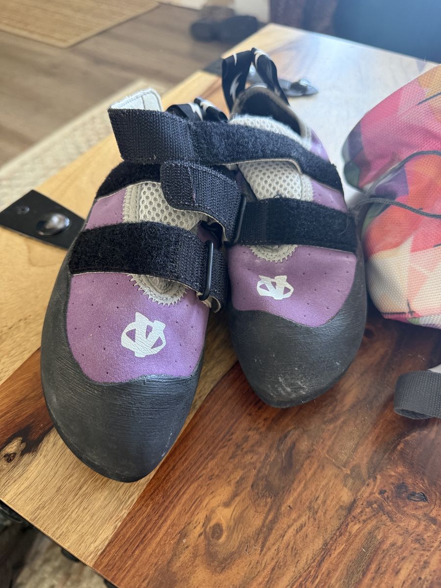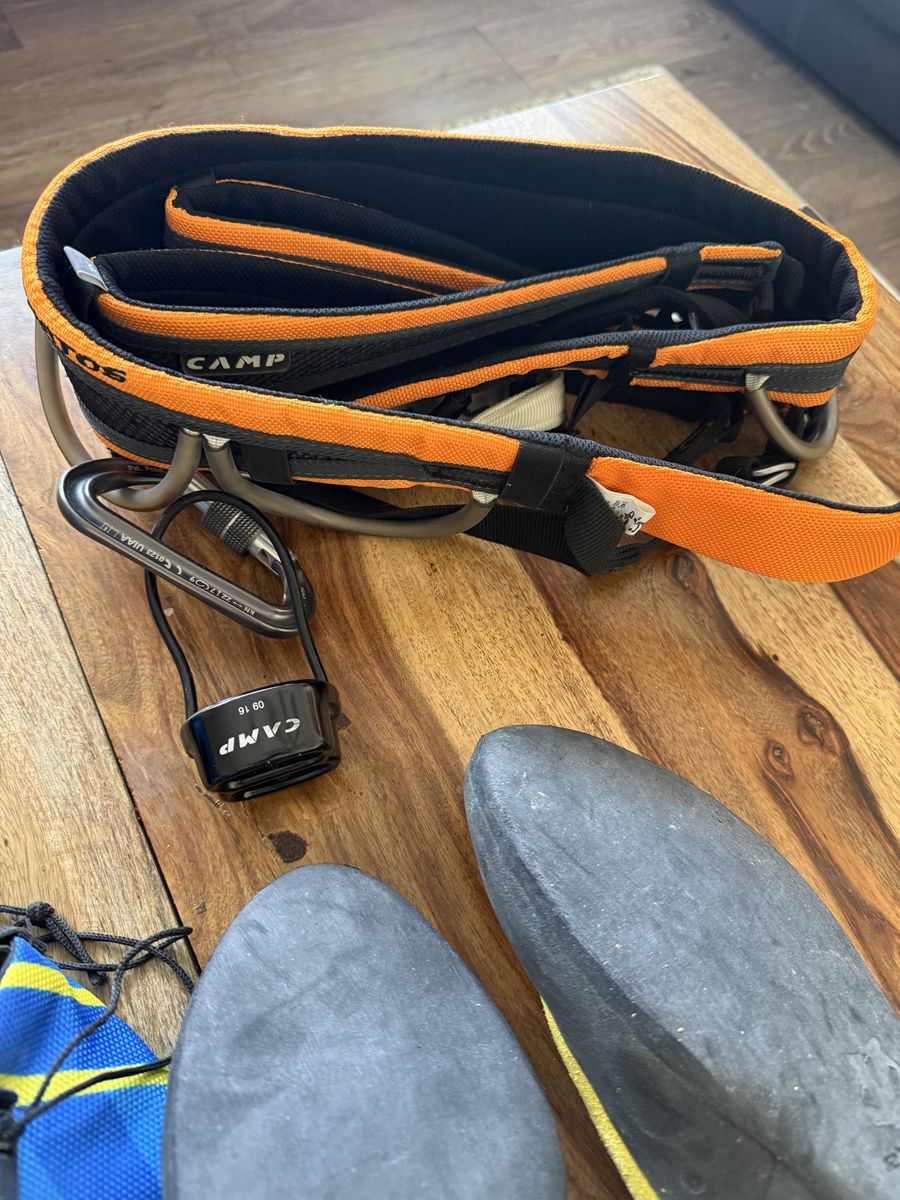 Zelle500 OBO open to offers. Need gone quickly! Two different climbing harnesses a women’s S and a men’s XL. Shoes are a size 6.5 women’s and 12.5 men’s. Two chalk bags and a little extra chalk. Perfect for a starter couple or kids! Send a message open to offers. These are in great condition and were used maybe 10 times.