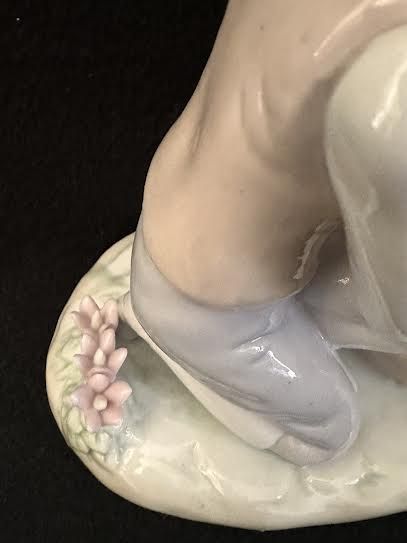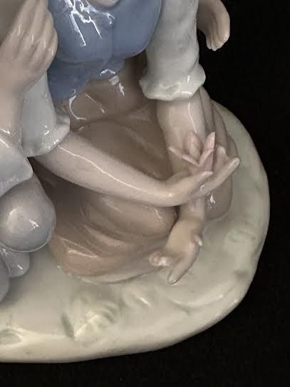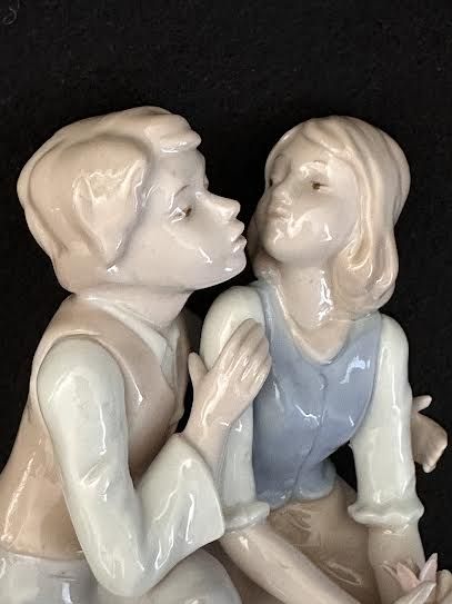VenmoArnart Conte porcelain couple figurine. Collectable 1986. Young couple kneeling in grass and flowers. Fine highly detailed craftsmanship with delicate facial features, gracefully posed arms and high gloss soft color palette in white, blues and tans.