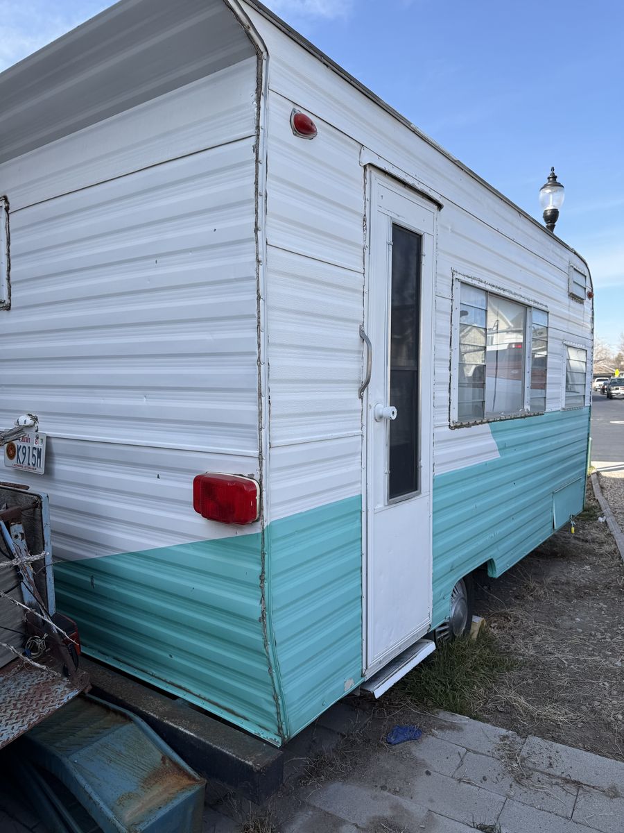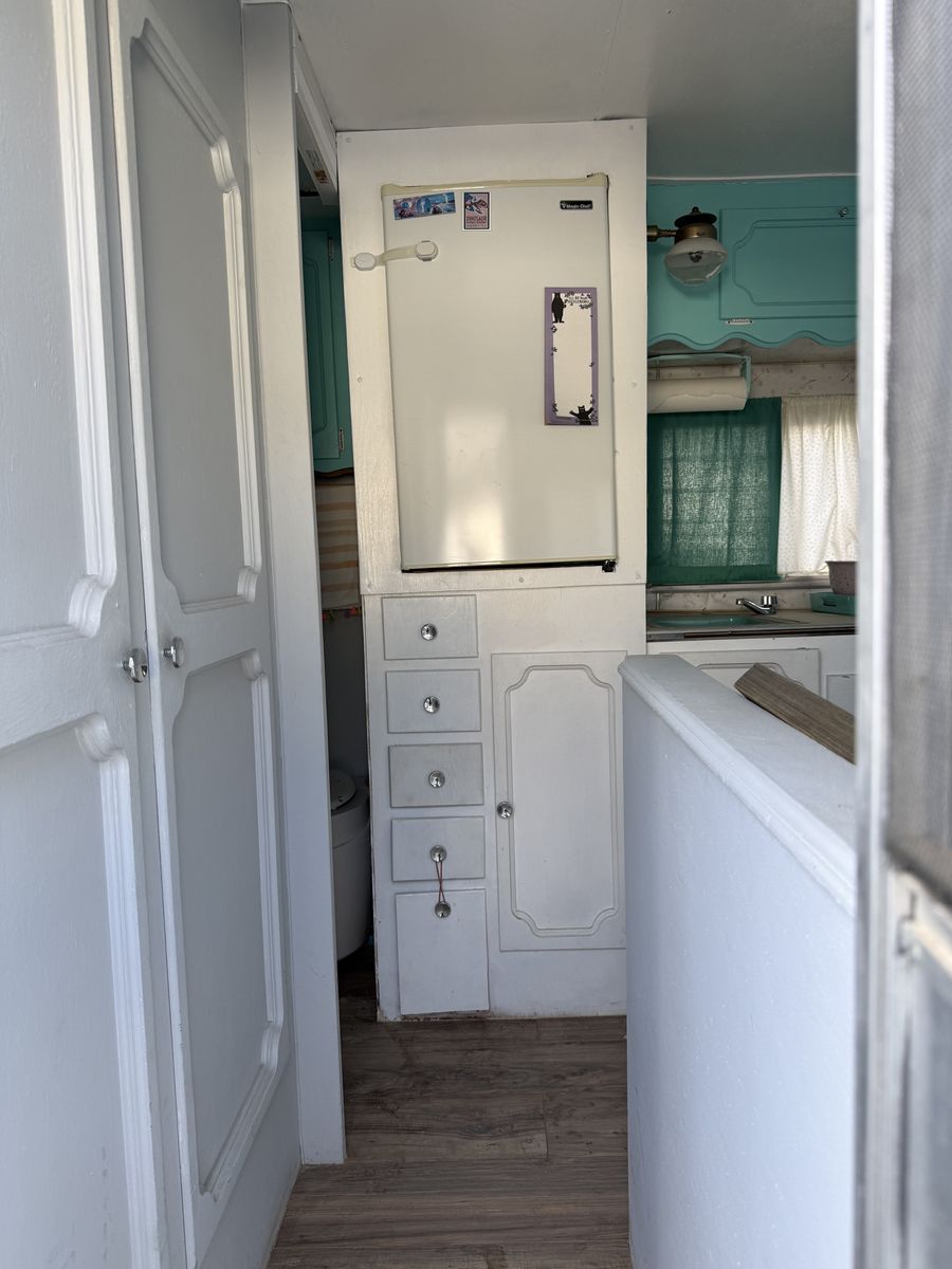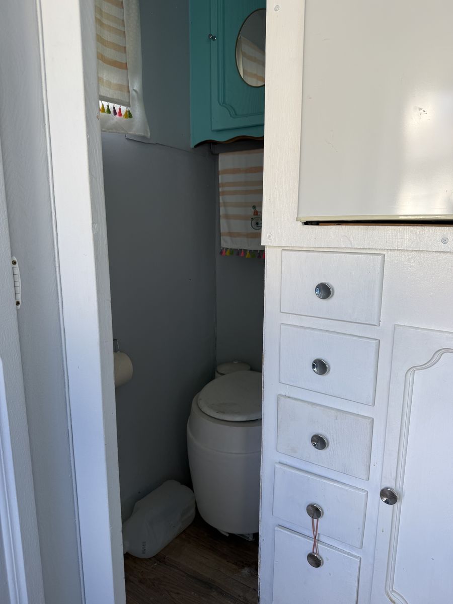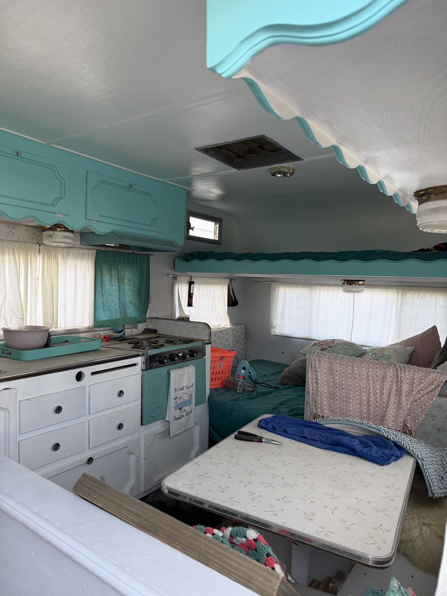 Fully restored in 2017. Original slatted windows, scalloped cabinets, stove/oven, sink, counter and table top. Updated curtains, cushion covers, bedding. Replaced exterior and interior wood structures. Reinforced back panel for adding a bike rack. Propane stove and pump water in the sink. Small portable toilet. Mini refrigerator.
