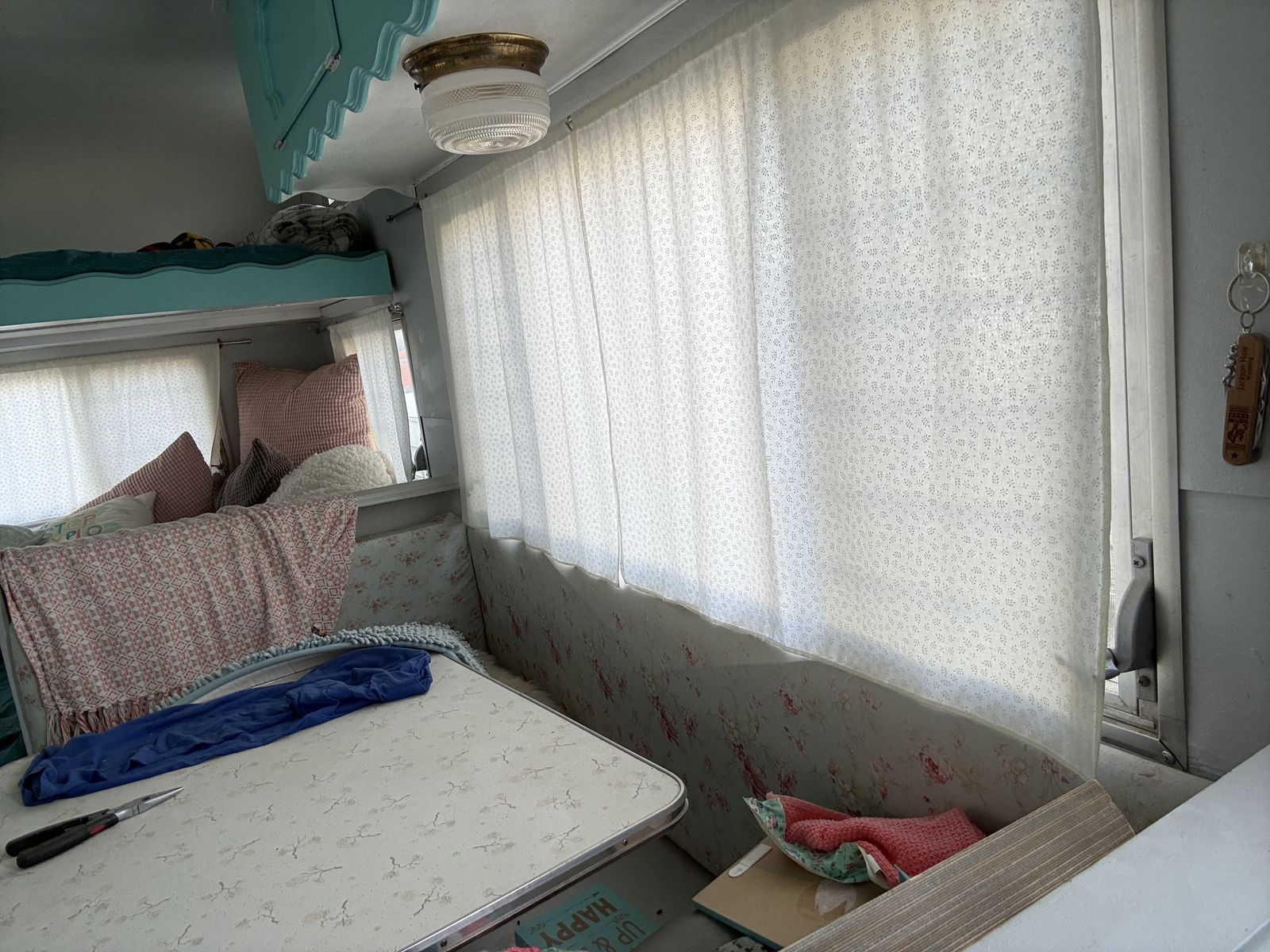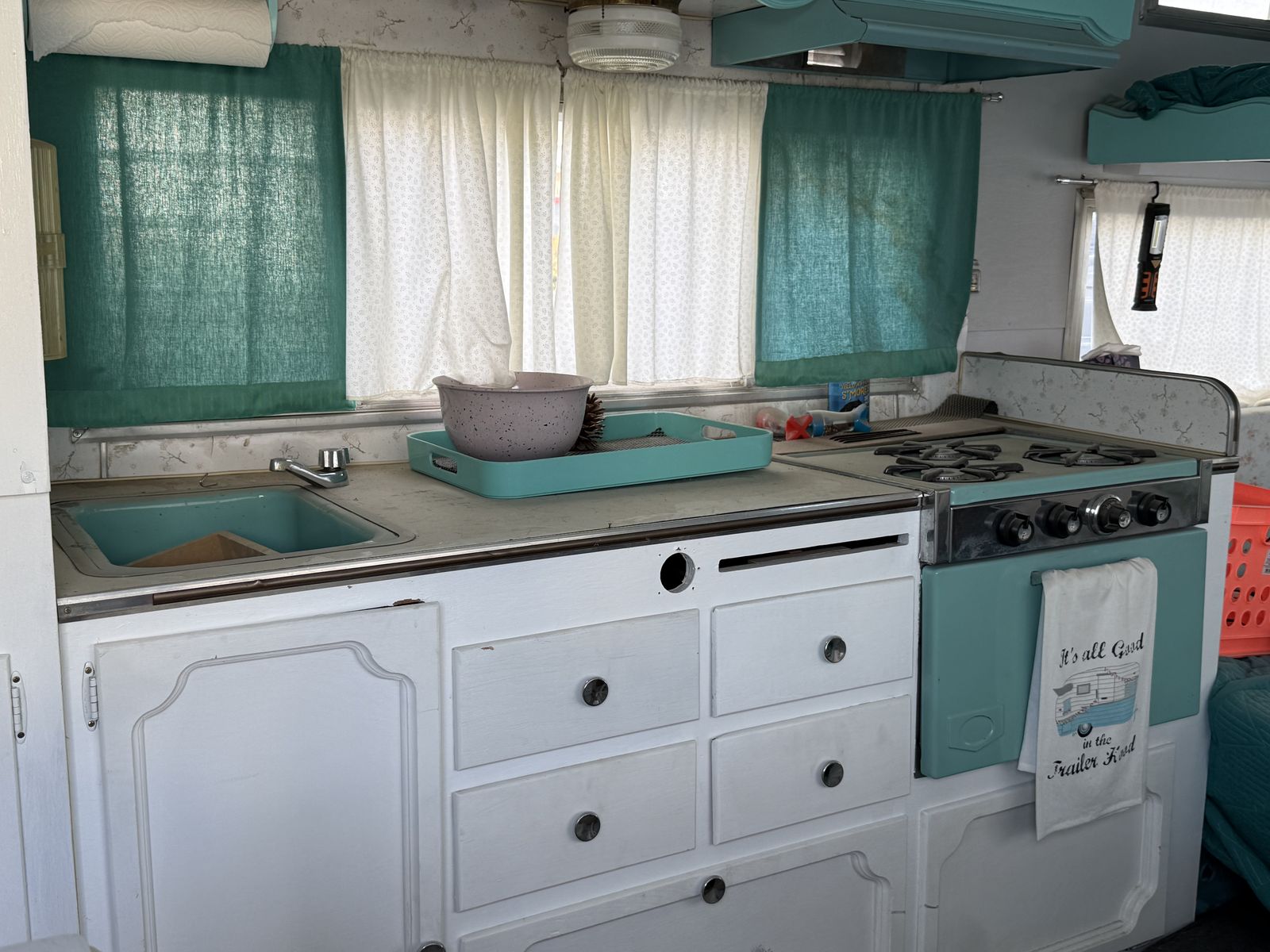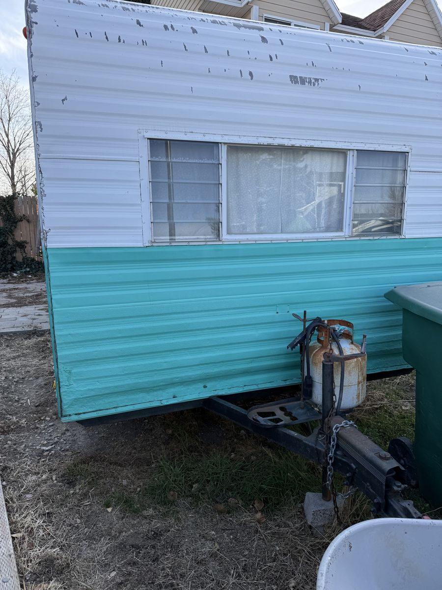 Fully restored in 2017. Original slatted windows, scalloped cabinets, stove/oven, sink, counter and table top. Updated curtains, cushion covers, bedding. Replaced exterior and interior wood structures. Reinforced back panel for adding a bike rack. Propane stove and pump water in the sink. Small portable toilet. Mini refrigerator.