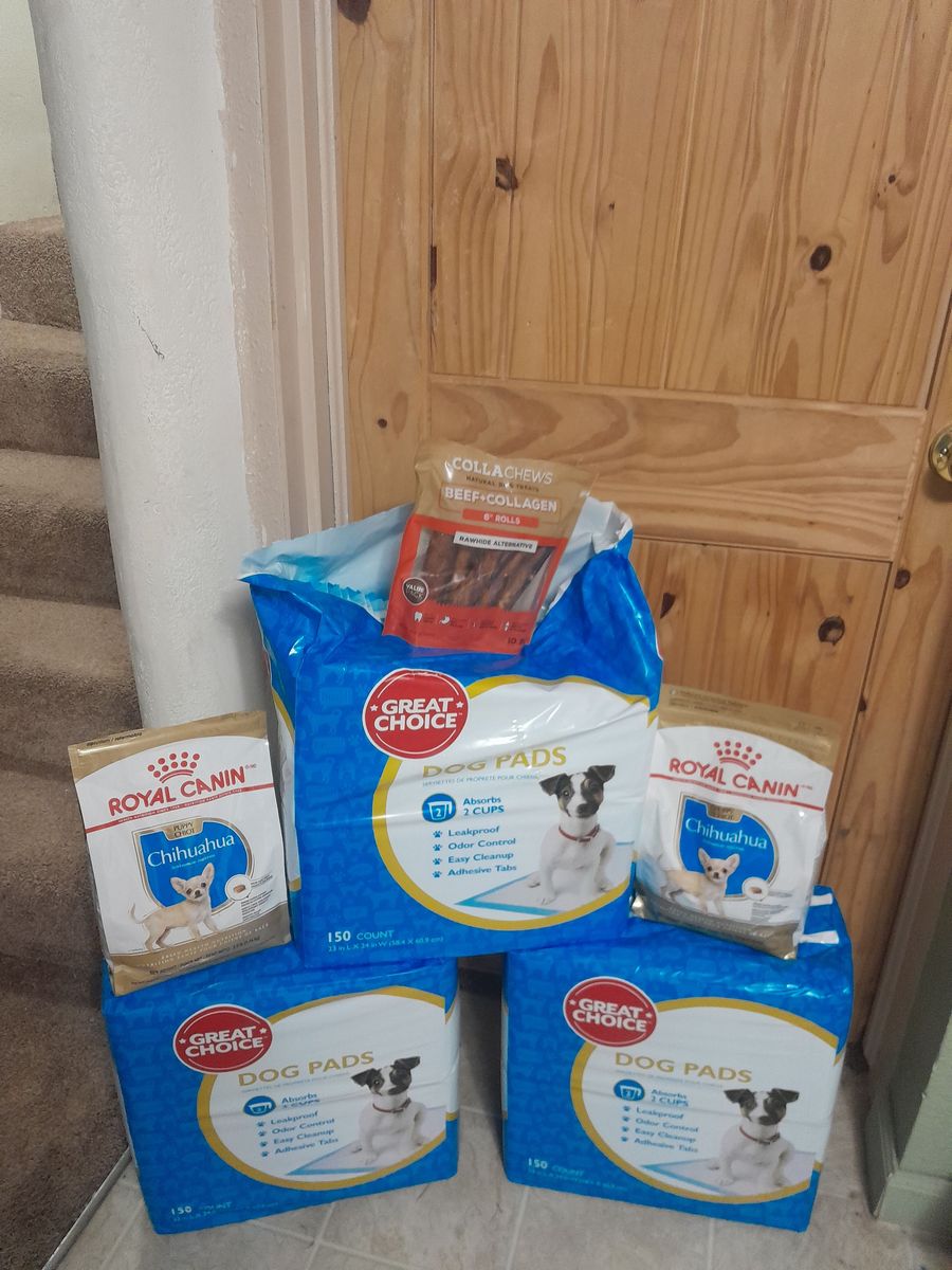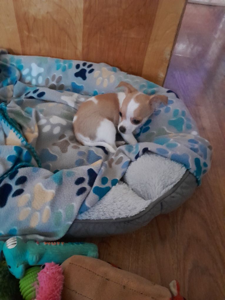 This is Taz he is 5 months old Chihuahua he has all his shots plus rabies he is 5 months old He is potty trained on potty pads and goes outside.He good with kids other dogs he is also kennel trained. His birthday is 10/5/25