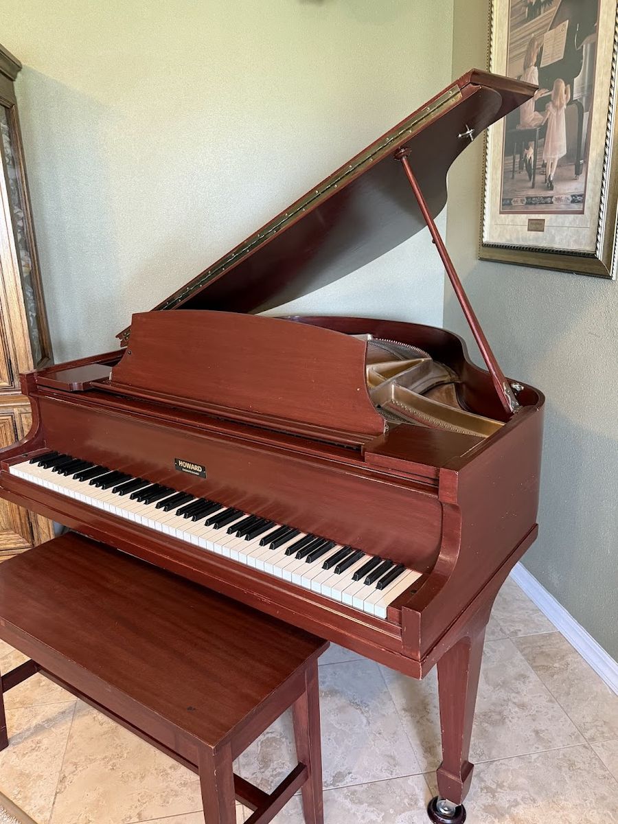 Howard by Baldwin Baby Grand Piano. Piano exterior was refinished in a merlo stain many years ago and had been regularly kept in tune as we have owned it.