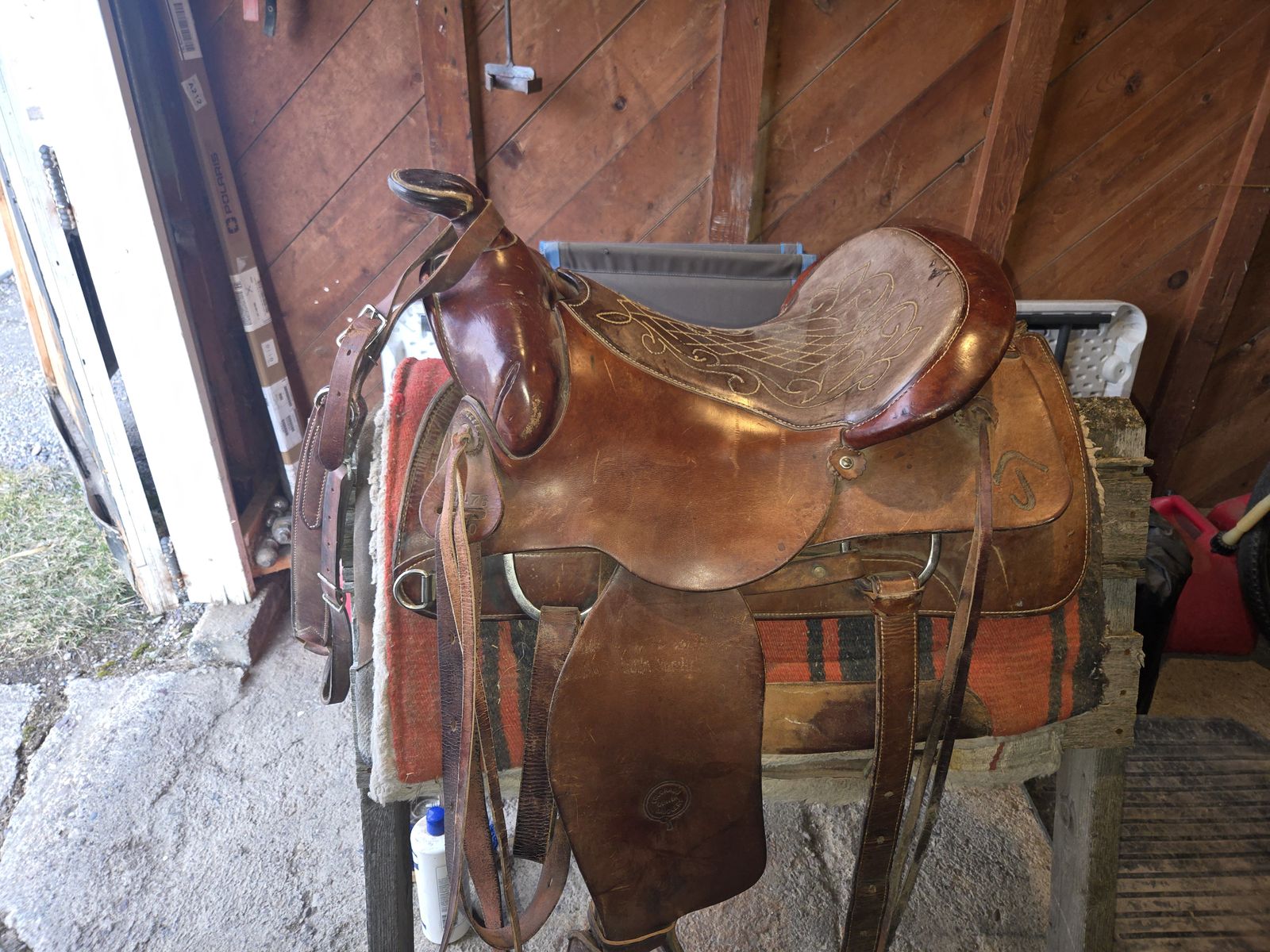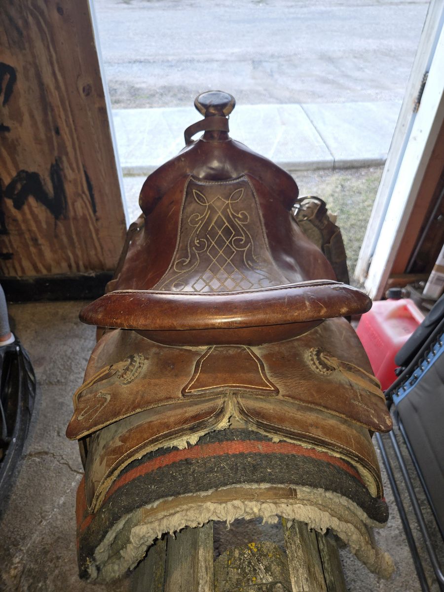 1981, or possibly older, 16.5" Seat Colorado Bowman Roper Saddle in great condition for sale. Included will be 3 saddle blankets, orange zippered nylon saddle bags, several leather and nylon headstalls with snaffle bits and reins, old pair of leather chinks and some halters. No longer riding so I would love for someone to put all of this to use!