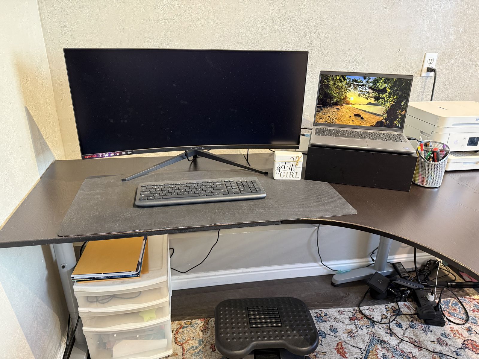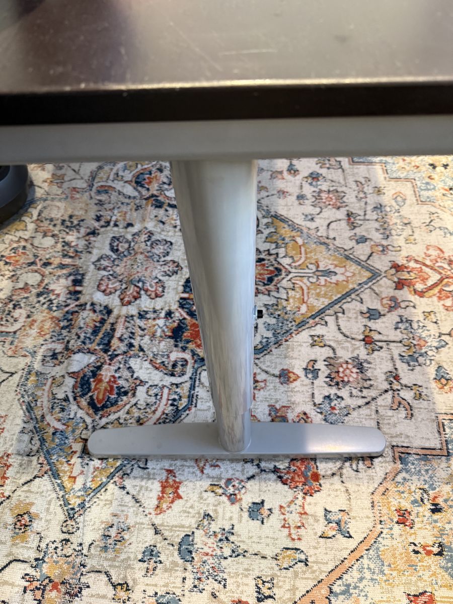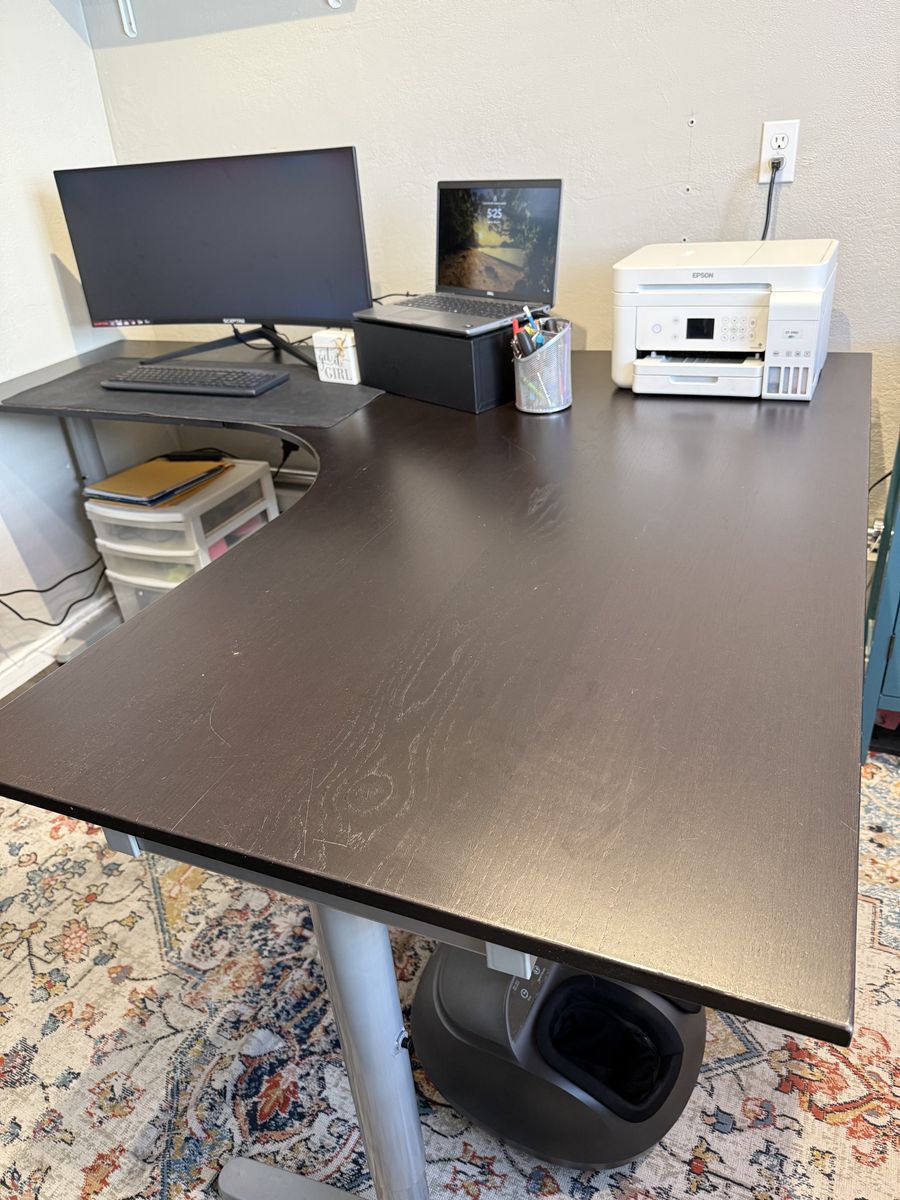 VenmoLarge L Shaped Desk, comes in two pieces. Dark wood top with silver metal legs. π¦΅