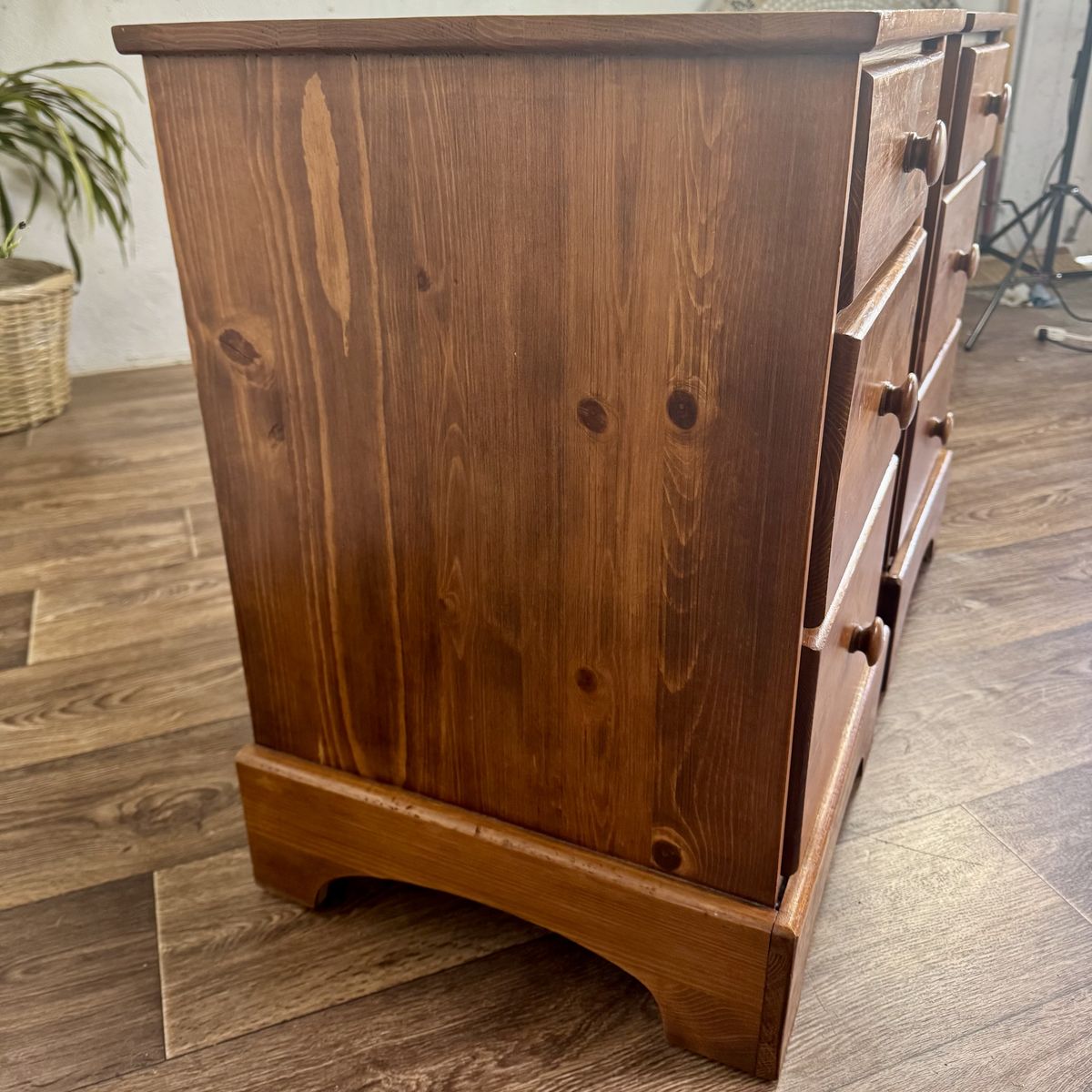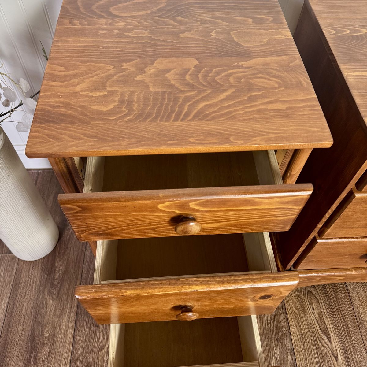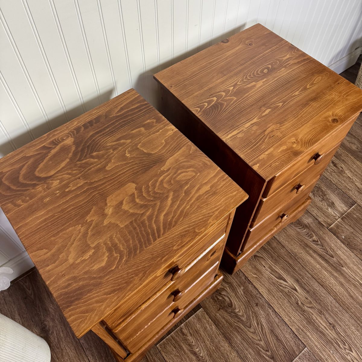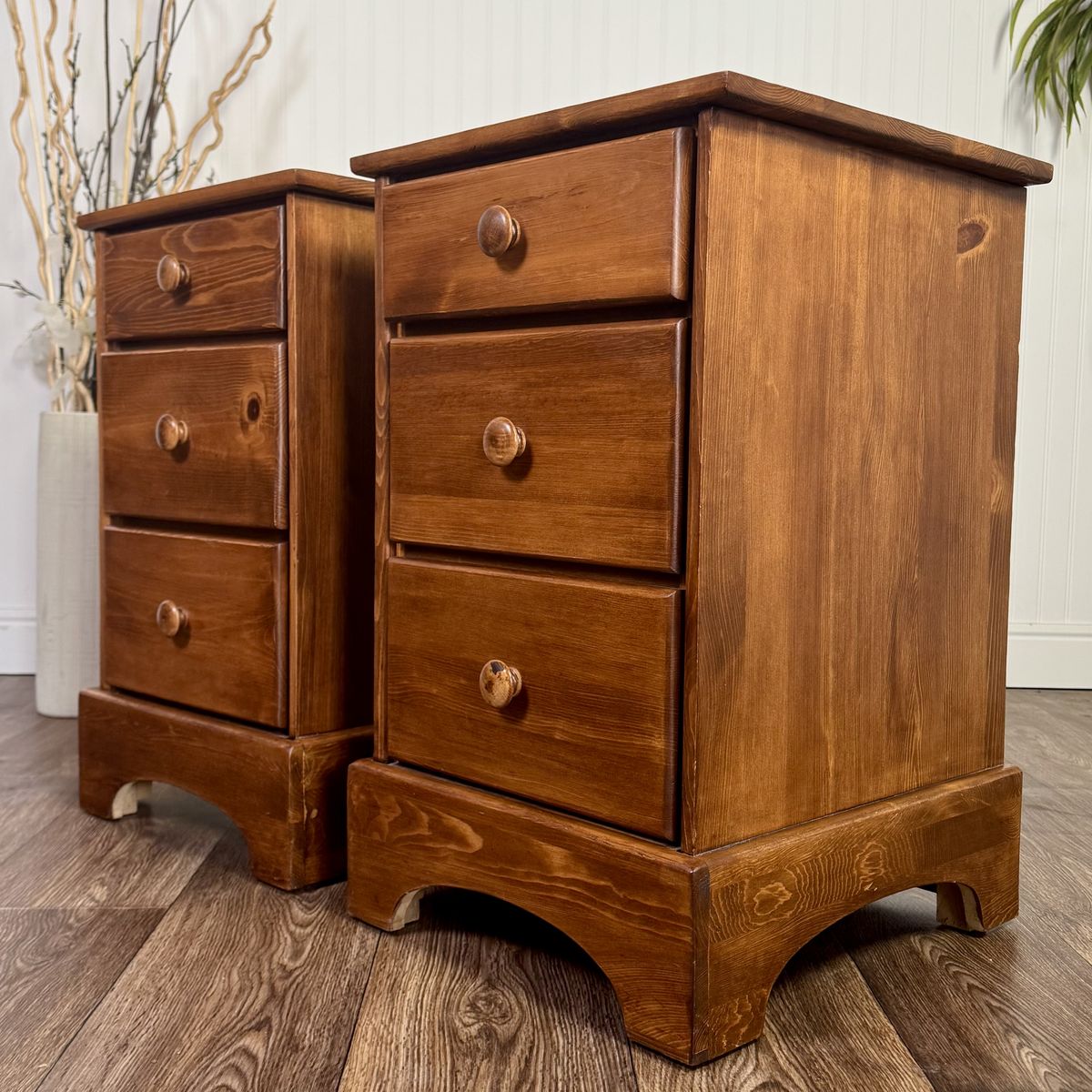VenmoMatching pair of vintage pine nightstands by Brookens Mfg. Inc. (Portland, Oregon). They feature a warm honey-amber finish that fits perfectly with mountain modern, rustic, or boho-farmhouse interiors. Each unit has three deep drawers for ample storage and original solid wood pulls.