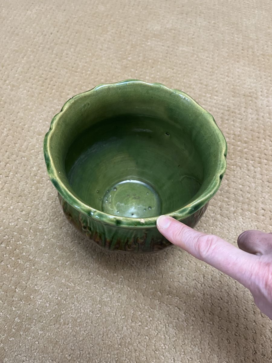 VenmoThis was made in about the 1920's. I believe it is from the Weller Pottery Company. It is a drip glaze design that was all the rage at that time. This has a pretty green on the top that blends into a chocolate brown on the bottom. The glaze is a gloss. This measures 6 1/2 inches tall x 6 3/4 inches across the top, and the base is 4 inches wide. There is a tiny glaze skip under the top rim. Inside the pot there are small flecks of pottery, that are inside the glaze. There is a little bit of hard water inside that I have not tried to remove. There is a tiny spot where the glaze is missing. There are no markings on this planter. It has a classic design that any pottery lover would love. It is about 100 years old and the wear is consistant to the age and use. It is a beautiful anitque planter or pot. Must see. Price is firm.