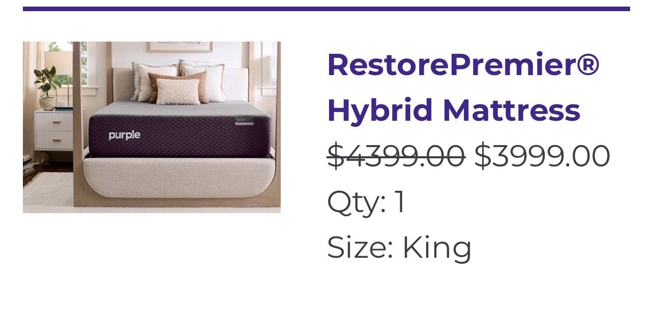 ApplePayBought this directly from Purple Mattress 6 months ago. I love this mattress but husband wants a firmer mattress. My favorite mattress of all time, especially the cooling feature. It’s their premier king mattress! Like new. Paid $4,200.00.