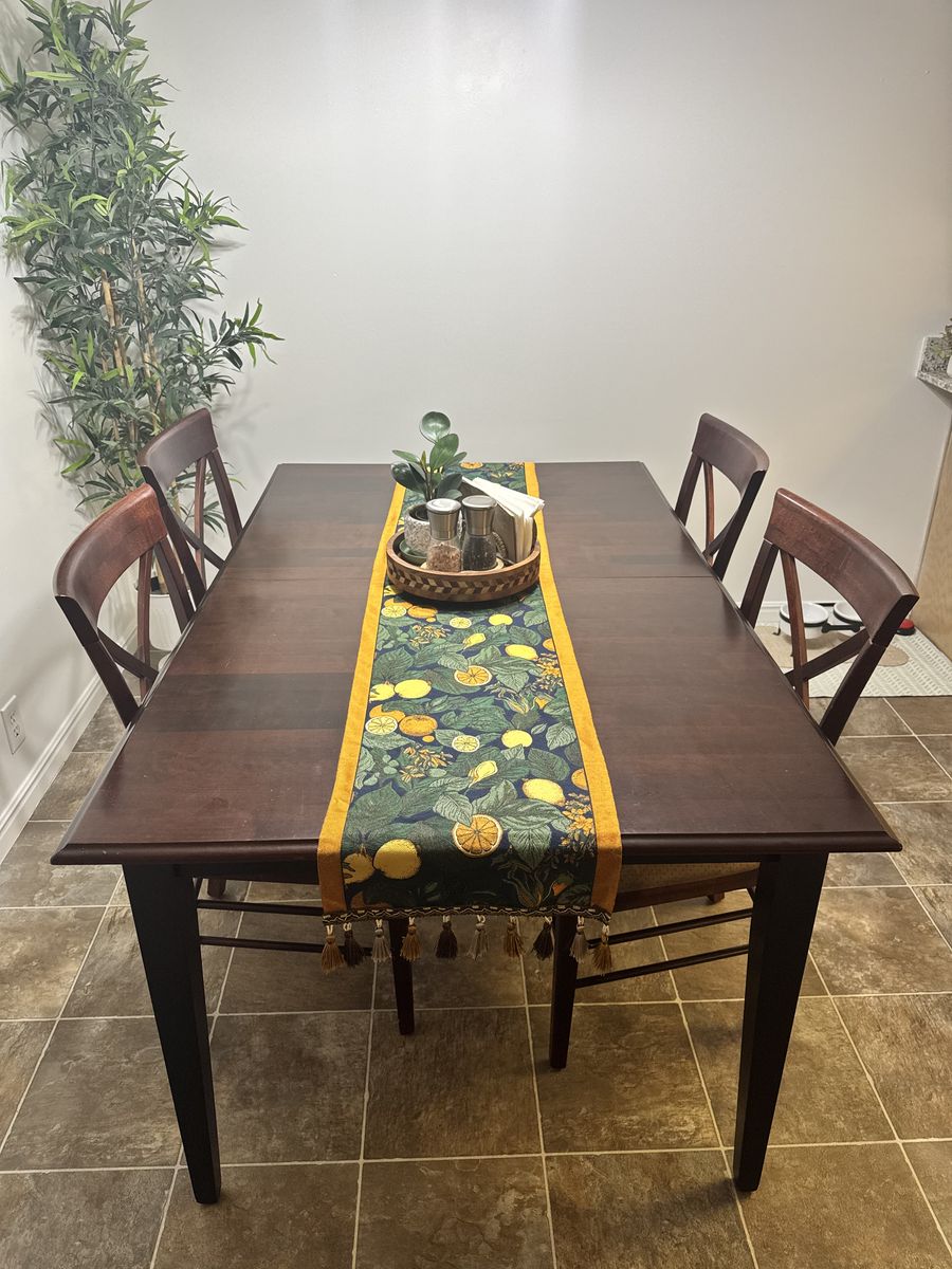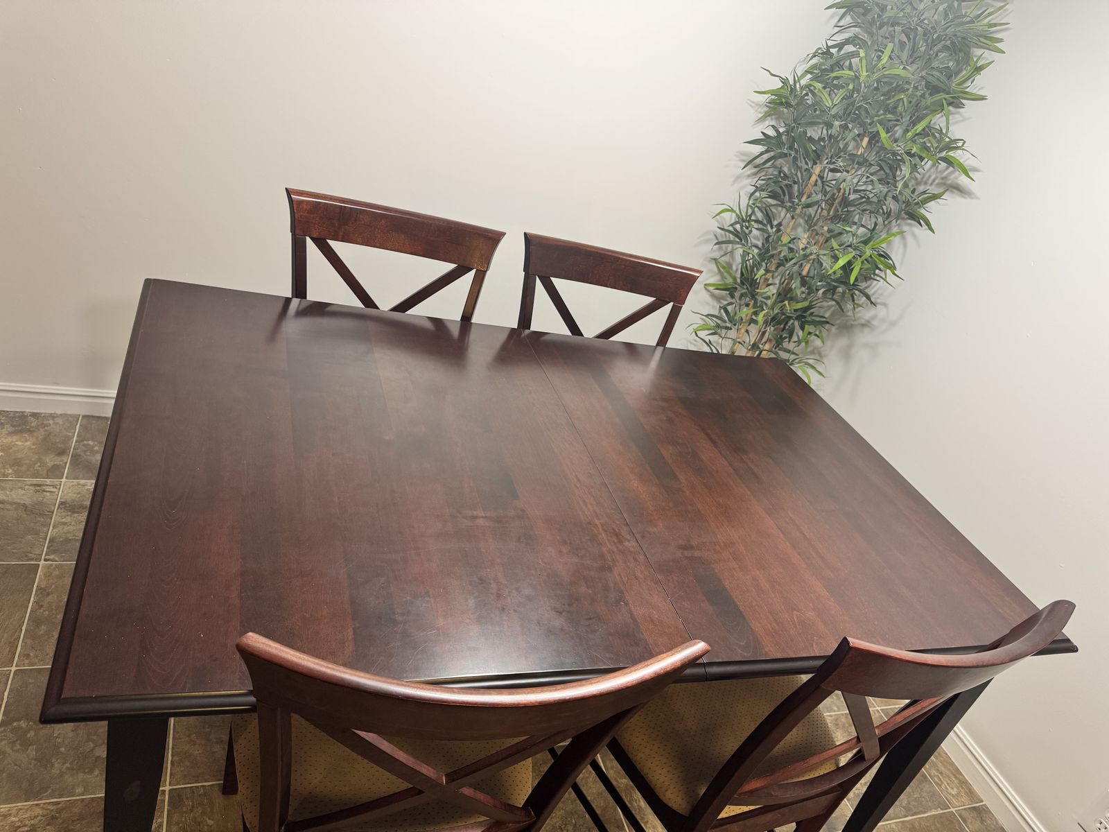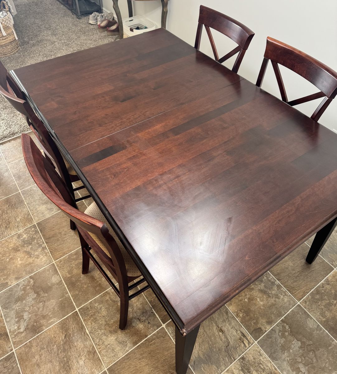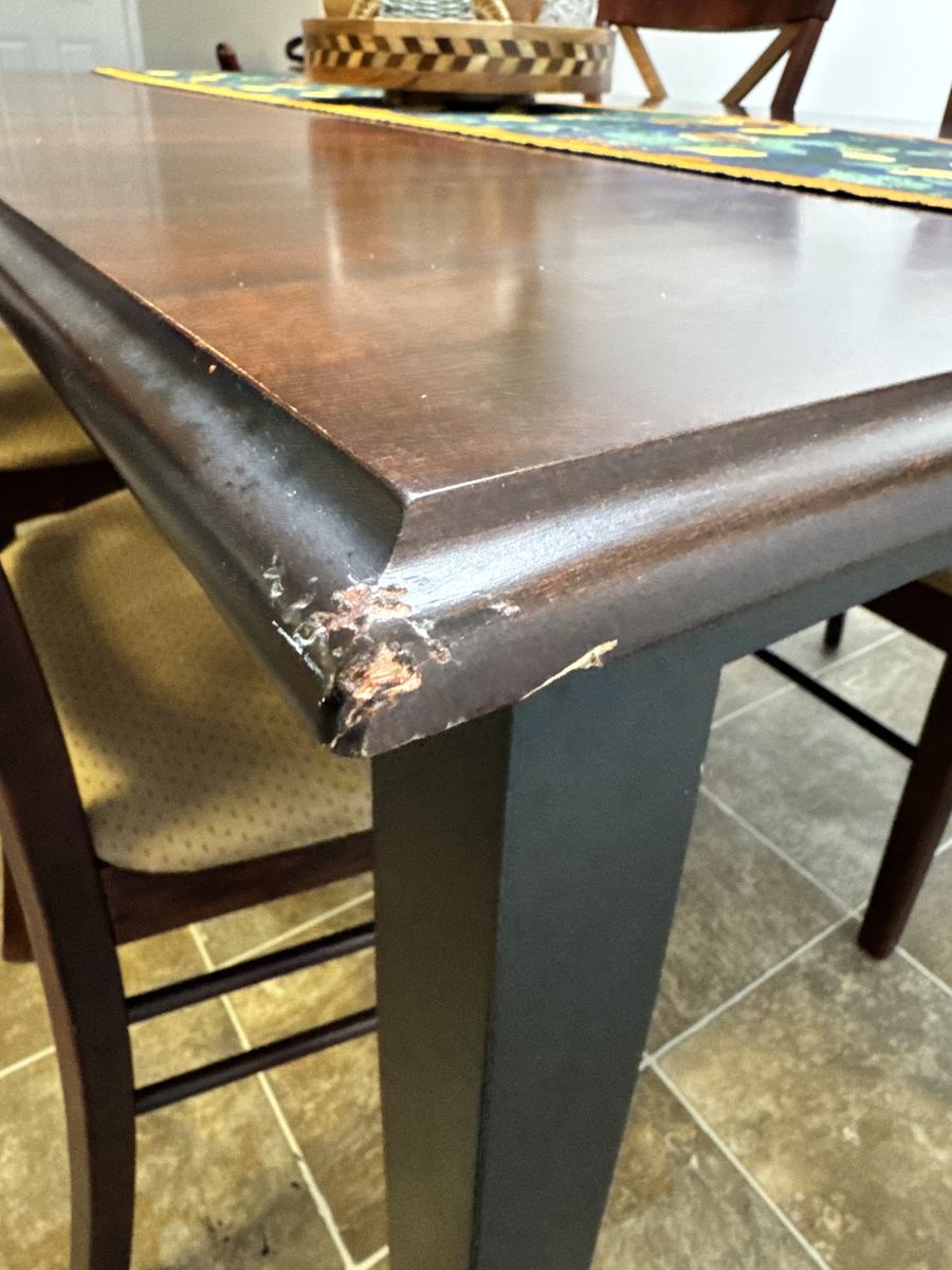 One of the corners of the table does have some damage from when our dog was a puppy. My husband says that corner could be sanded and refinished if desired.