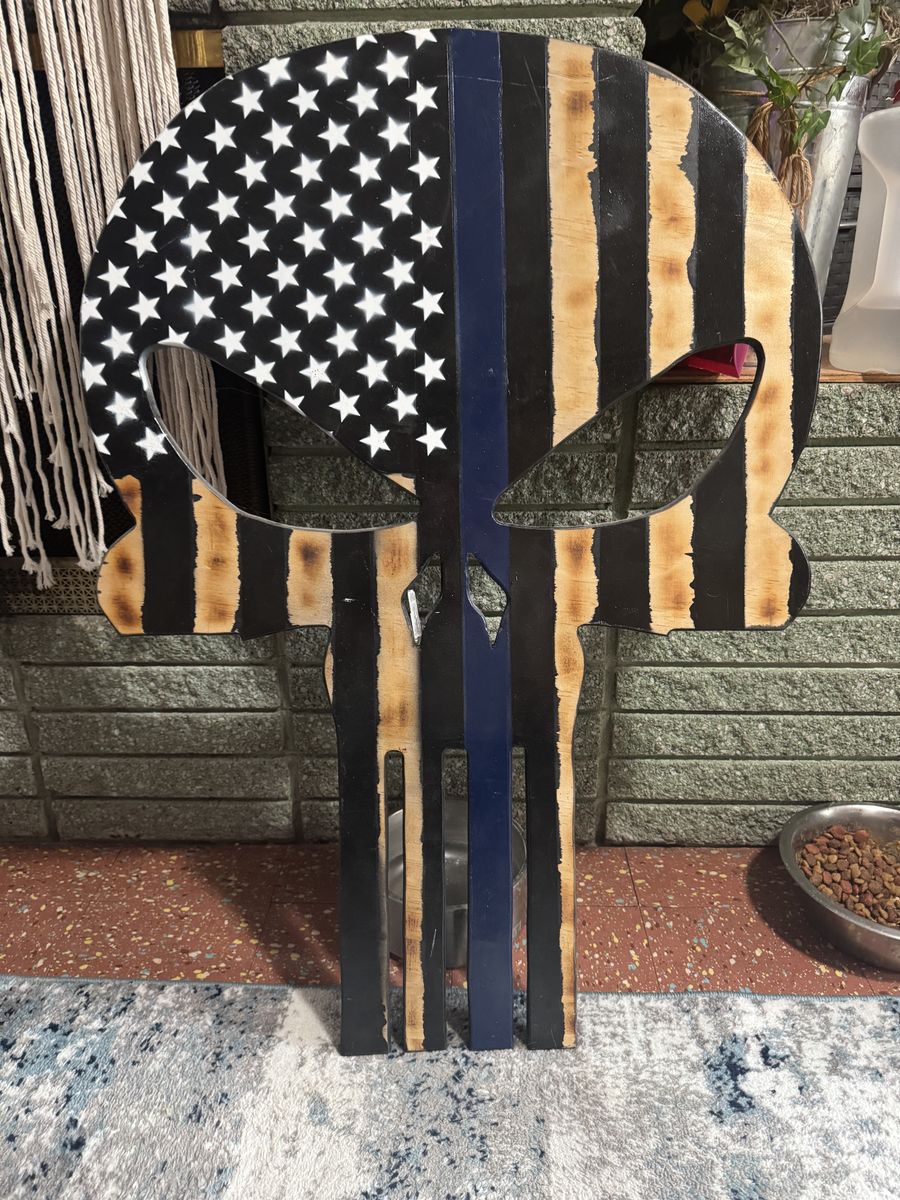 VenmoHand made wooden Thin Blue Line punisher skull. One solid piece 27.25(W) x 38.5(T) x .75 (Thick)