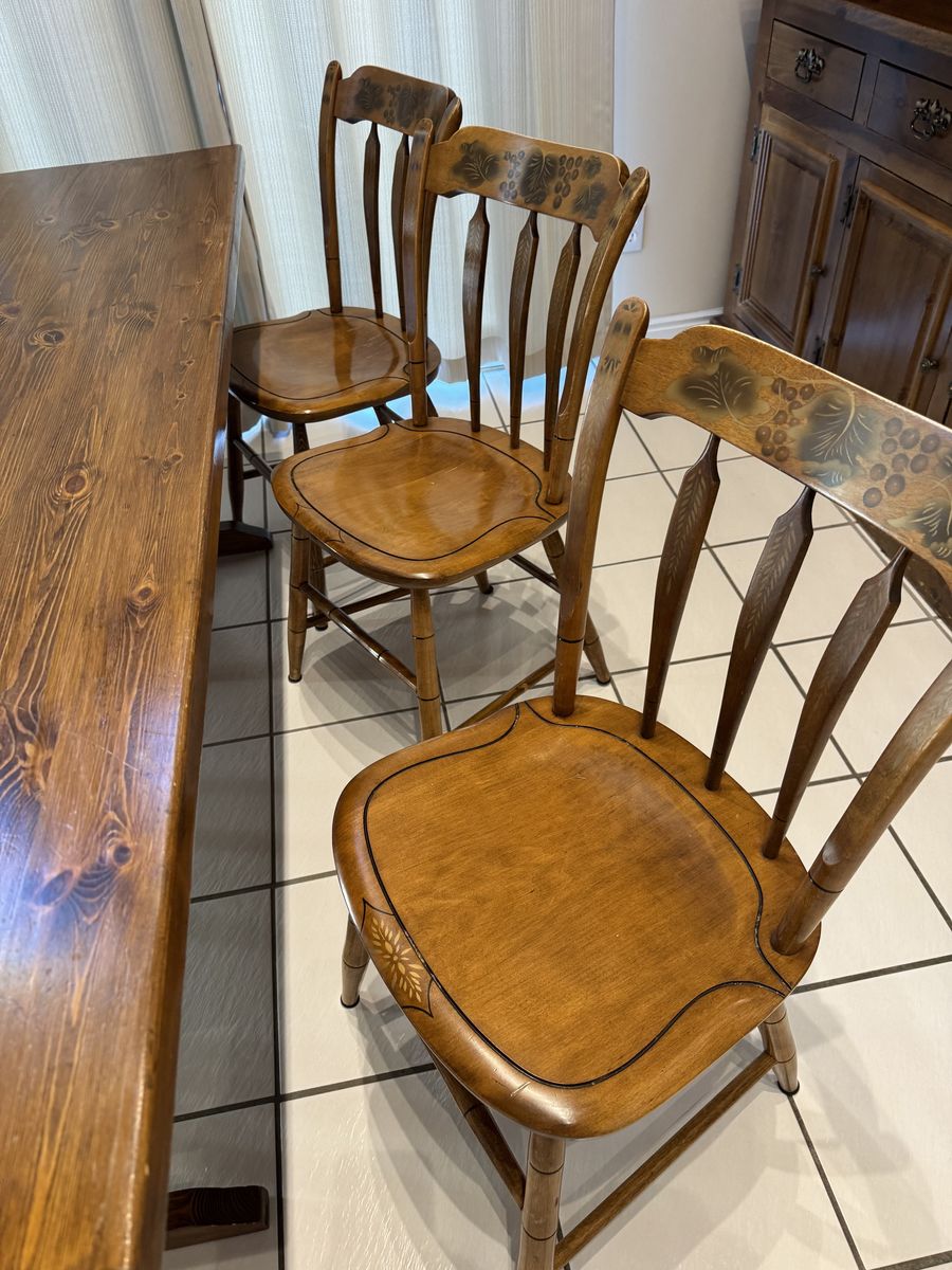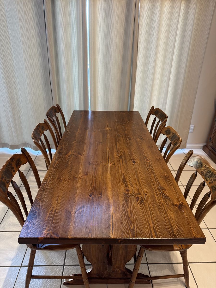 VenmoBeautiful, rustic solid wood dining table with 6 matching chairs. This set features a rich, dark honey finish and classic spindle-back chairs with carved floral detailing on the backrests. It’s a sturdy, farmhouse-style set that’s perfect for family dinners or a kitchen breakfast nook.