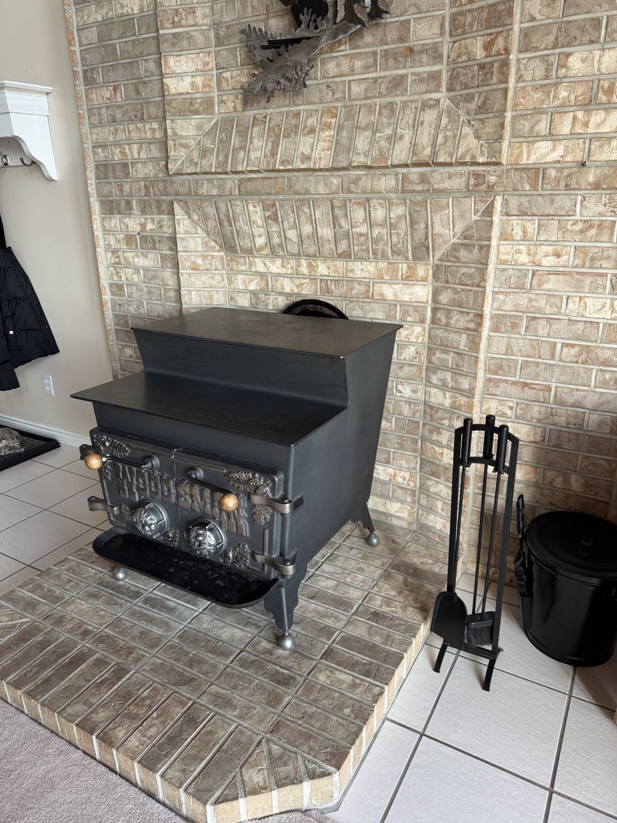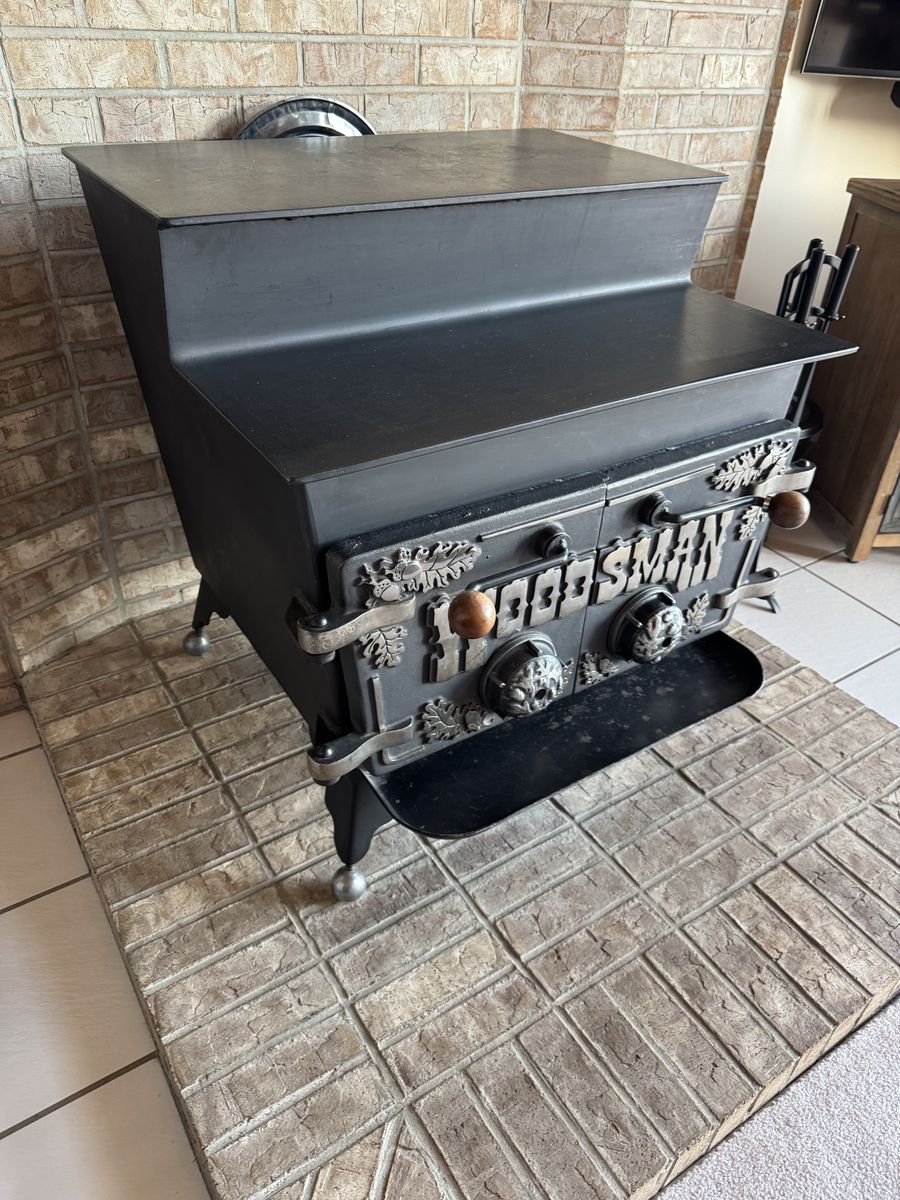 This is an absolutely beautiful Woodsman wood-burning stove in like-new condition. It has been meticulously maintained and features rare, highly detailed cast-iron doors with an oak leaf and acorn motif. This isn't just a heater; it’s a centerpiece for a cabin, lodge, or rustic home.