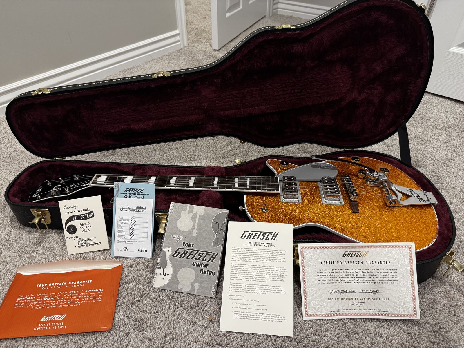 Condition • Mint — no scratches, dings, buckle rash, or fret wear • Neck is straight, truss rod functions perfectly • Electronics are flawless • Bigsby is smooth and stable • Includes original Gretsch Deluxe Hardshell Case + all candy