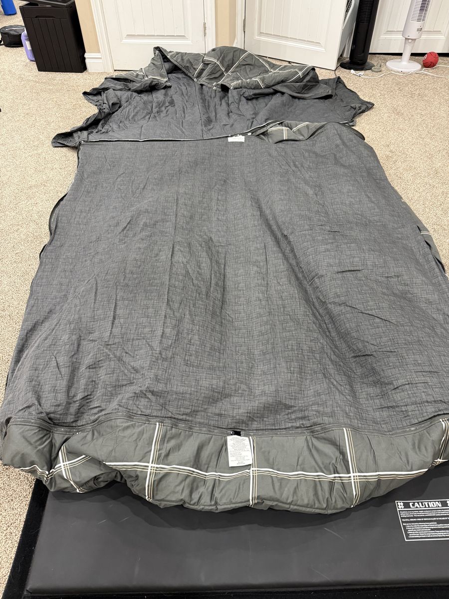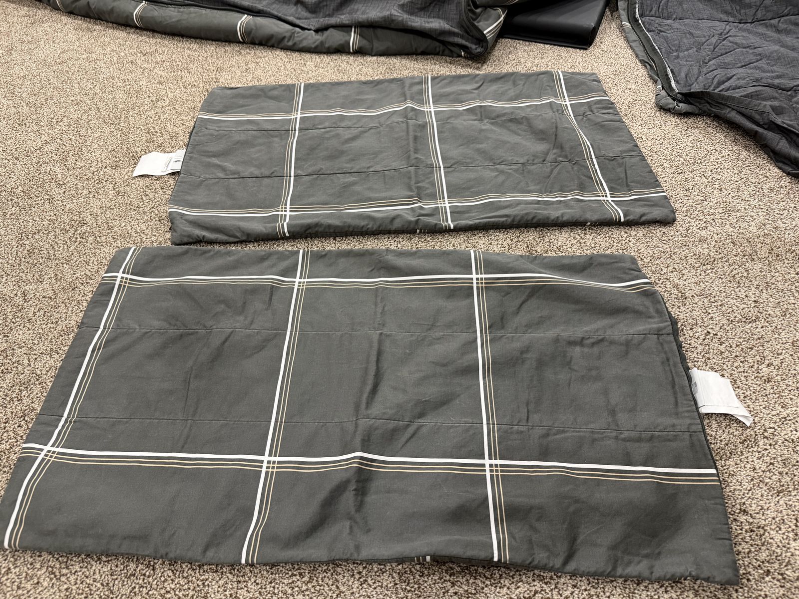 Has 2 shams and 2 cases and 1 sheet. Has some minor signs of wear, zipper teeth broken at very top so the last little top part doesn’t zip. 26MAR