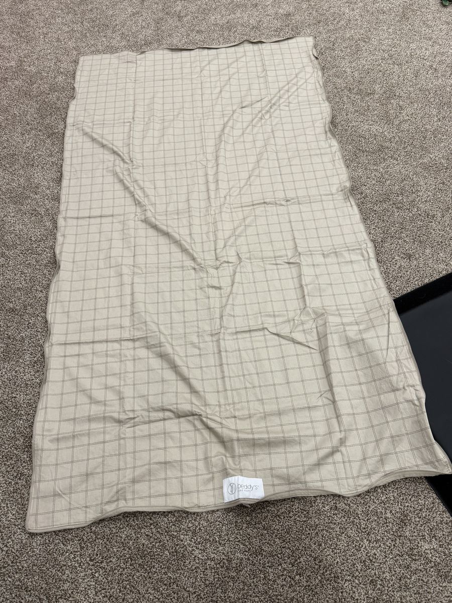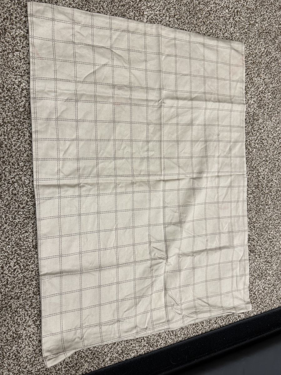 Has a sham and a case and 2 sheets. Faint redish color transfer on sheets/case. Minor. Mar33. $374 new