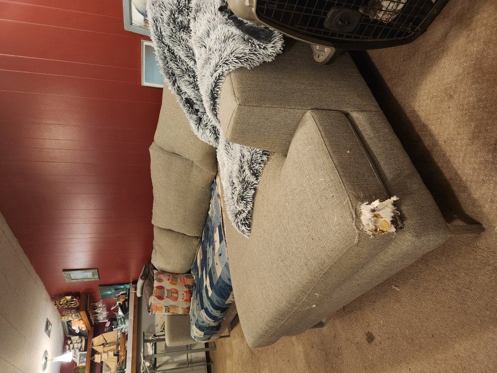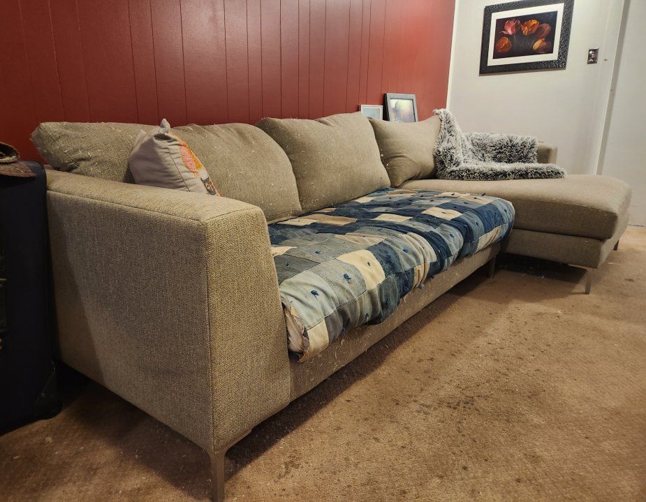 GooglePayFREE large sectional couch with chaise. 10ft wide. Chaise comes out 6ft. My dog chewed some holes in it when she was a puppy, I generally keep those cushions wrapped up in a blanket or a sheet and its not an issue. It's still a super comfortable couch but does have some damage. 2 pieces, one loveseat size plus the chaise. Located in South Salt Lake