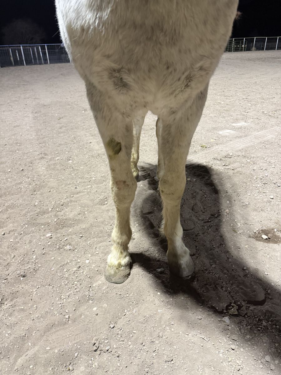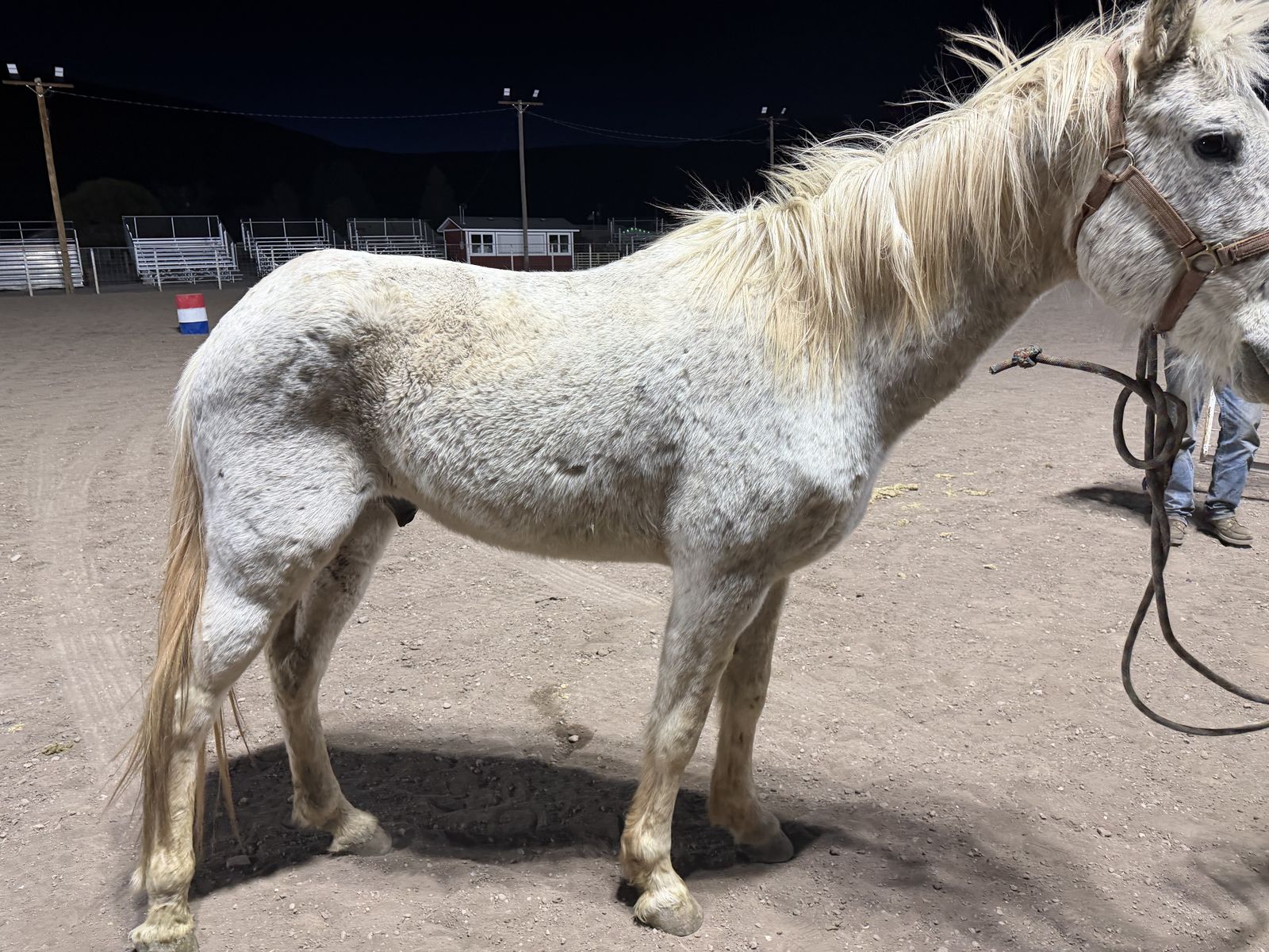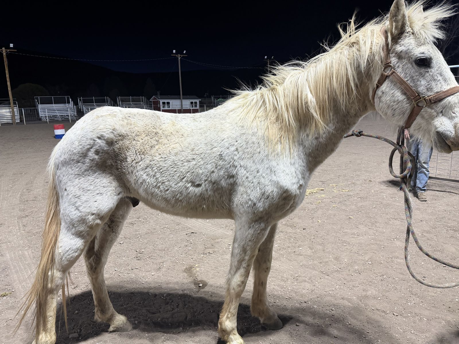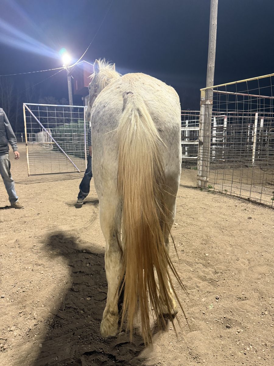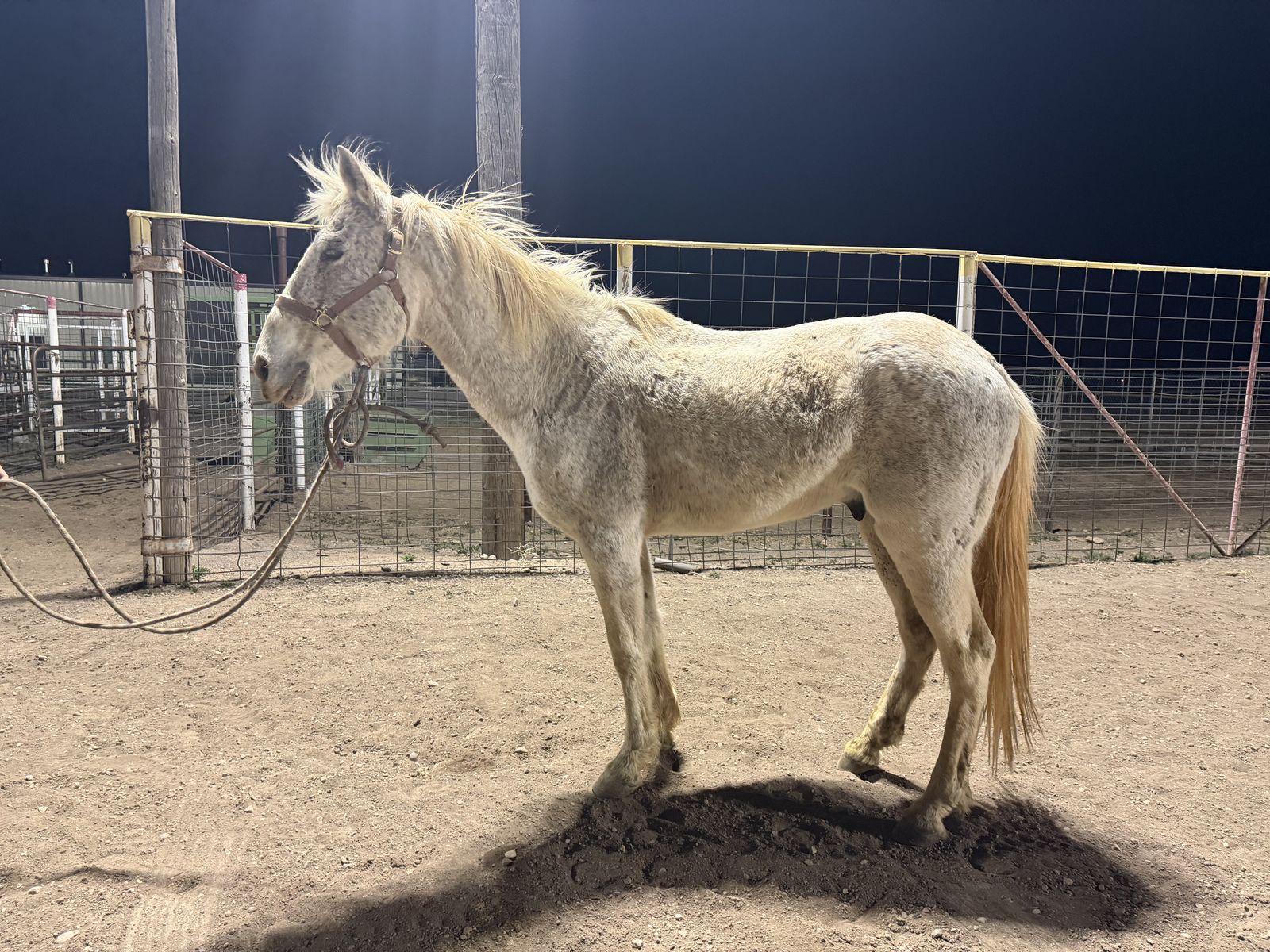 Big John is a 15 1/2 hand tall flea bit grey. Big dense bones. Grade but we aged him around 6 years old. Can hop on him bareback and ride him around! He was turned out before we got him so he needs some groceries. We don’t know a lot about him but he’s super gentle and wants to be loved on! Can pick up his feet! He’s still a stud but we’re getting him casturated soon! With a little more weight on him he’ll be as pretty as they come! Also have some videos! Give us a call or text with any questions! Asking 3,000 obo