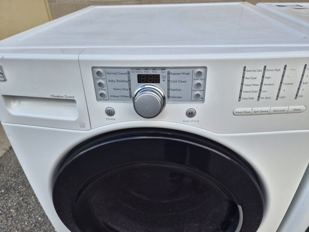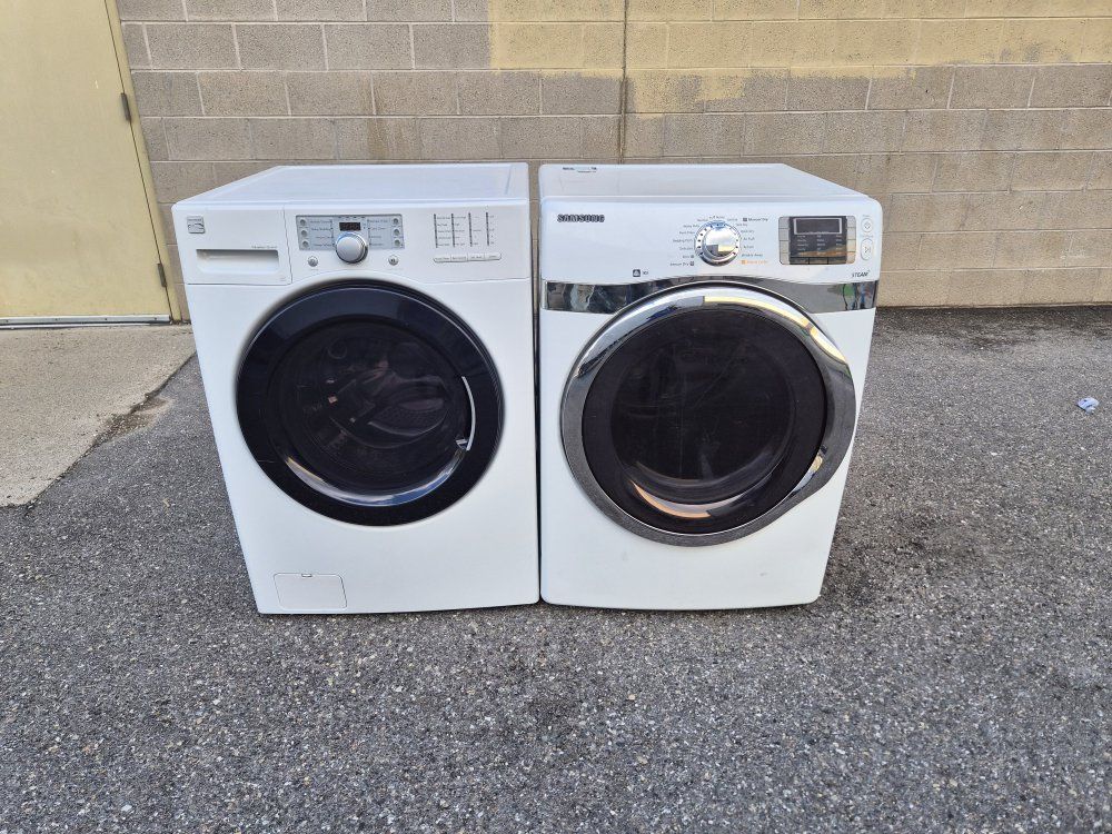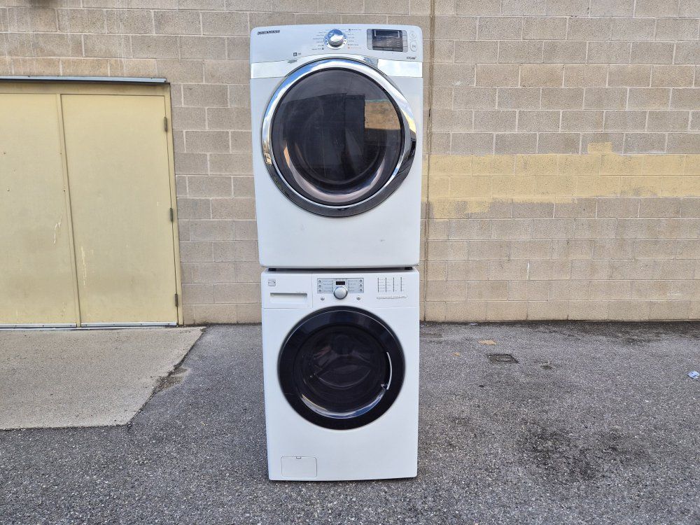 The washer and front-loading dryer can be used together or stacked. Heavy work and commercial quality. It has all the options, cycles and heat levels and it looks and works like new. It comes with warranty and delivery on the sidewalk available.