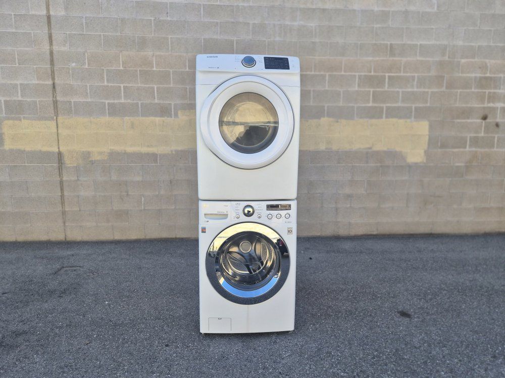 The washer and front-loading dryer can be used together or stacked. Heavy work and commercial quality. It has all the options, cycles and heat levels and it looks and works like new. It comes with warranty and delivery on the sidewalk available.