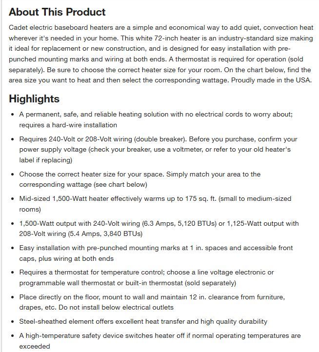 VenmoNew - Cadet Electric Baseboard 72 inch, 240/208-volt, 1,500/1,125-watt. Still in the Box!