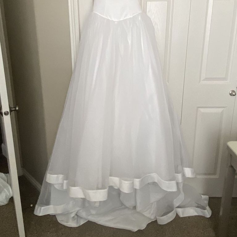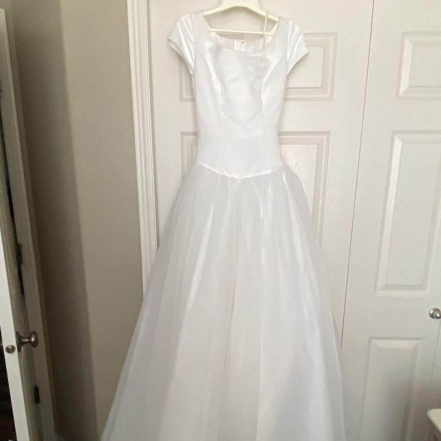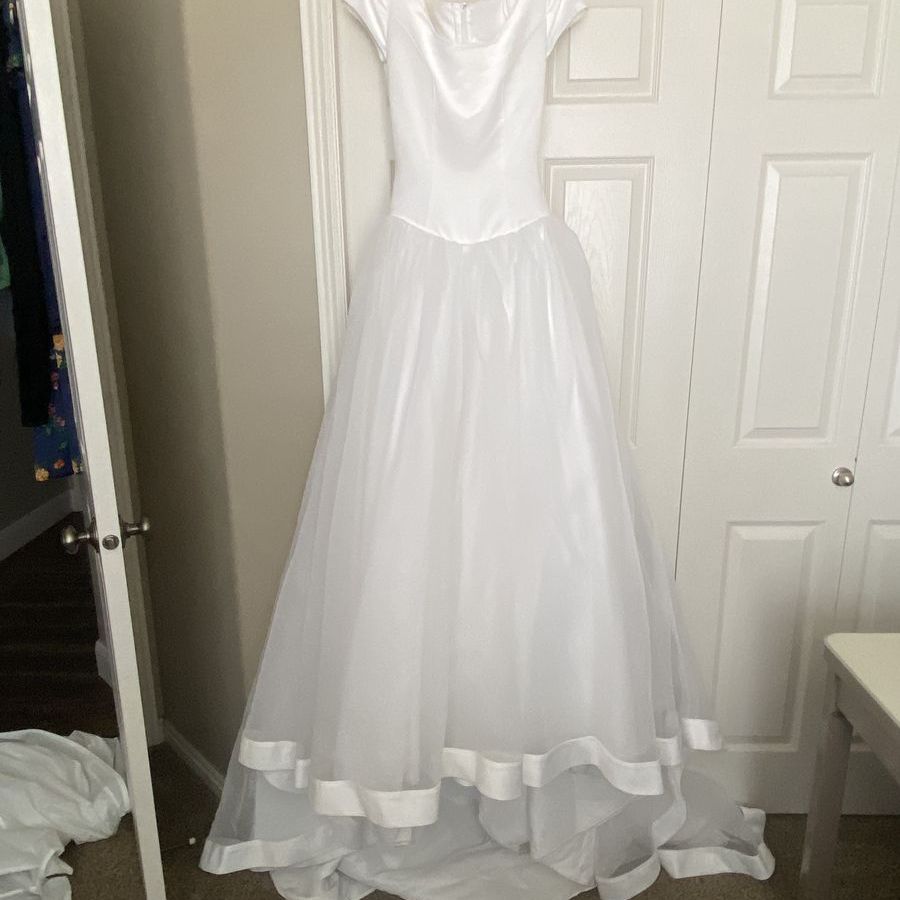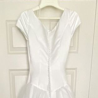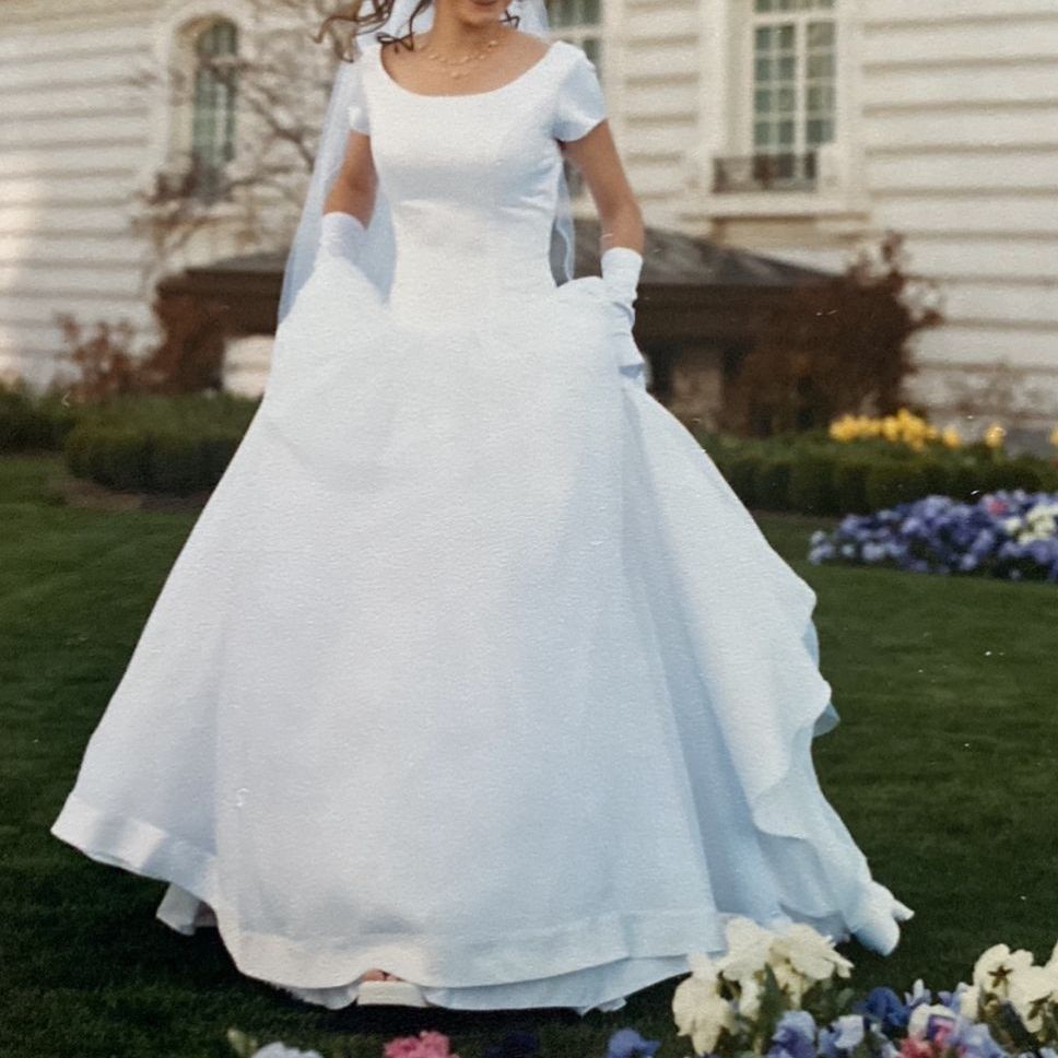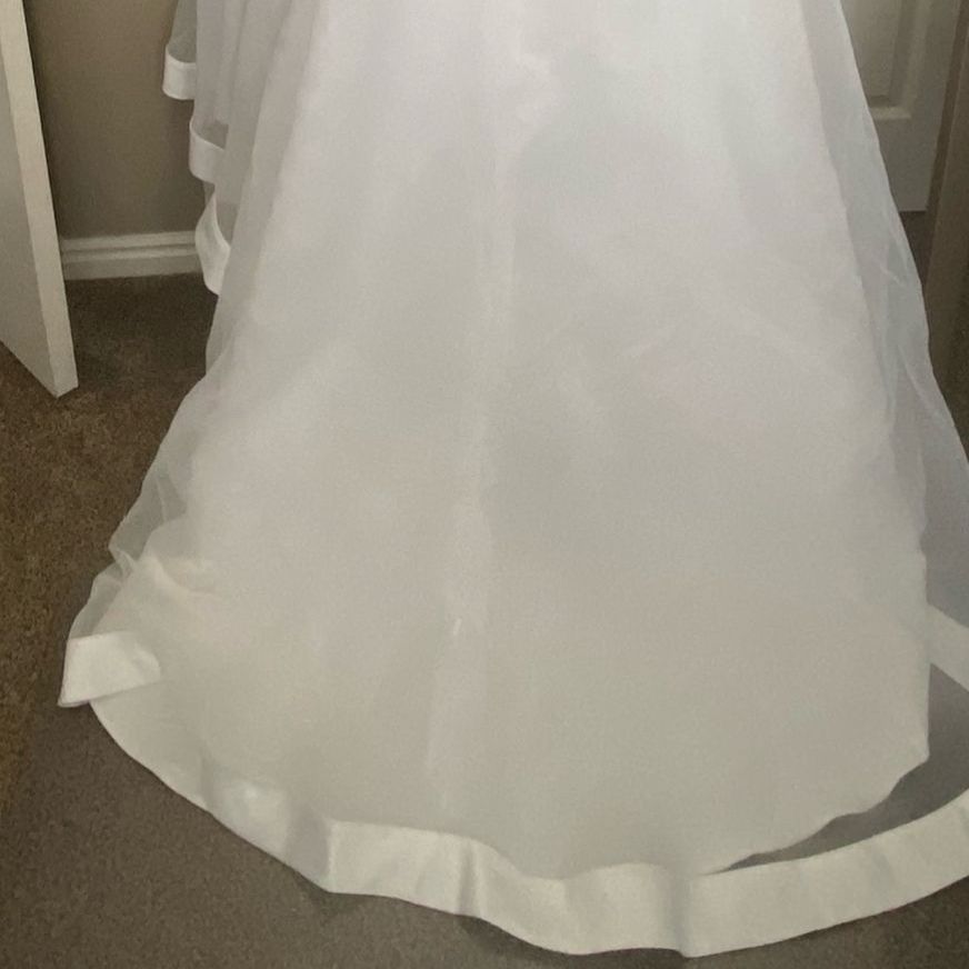 ApplePayClassic, stunning Enzio white wedding gown! Flattering in every way! Size 4 satin-like bodice, and tool at the bottom with satin trim gown only worn one time. Recommend Dry clean before wear, garment bag included from David’s Bridal. The back of the train has small invisible loops to button up the train when wanting a break from the train trailing on the ground. Model is 5’4, 32 B.
