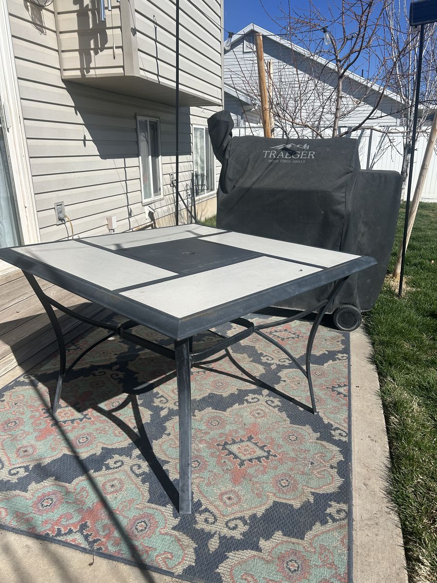 ZelleTable only. Seats 4. Center open for umbrella or you can remove the whole square. Has some paint chip and could use a new coat but structurally strong.
