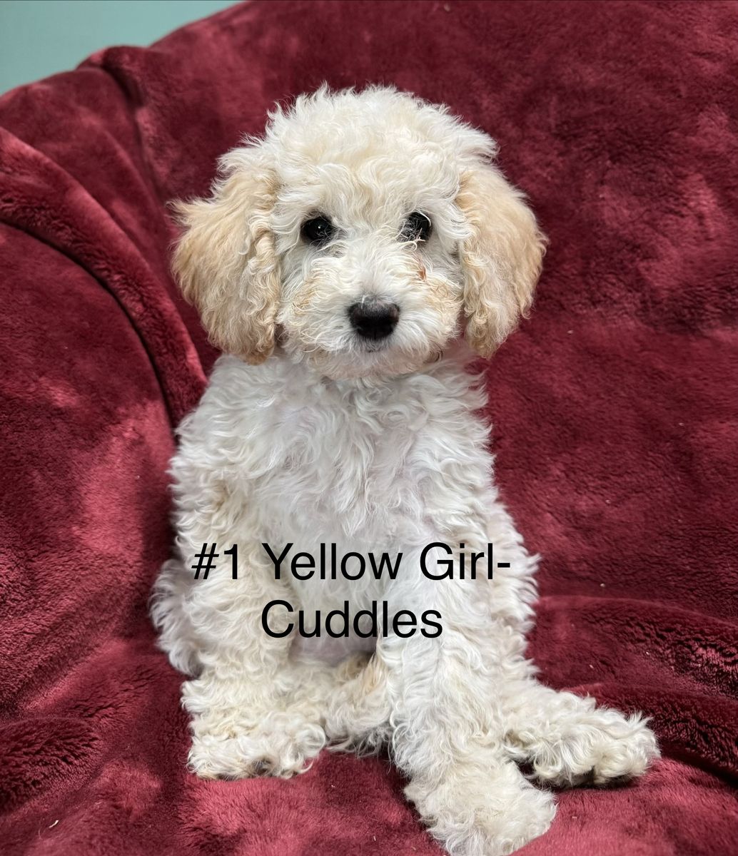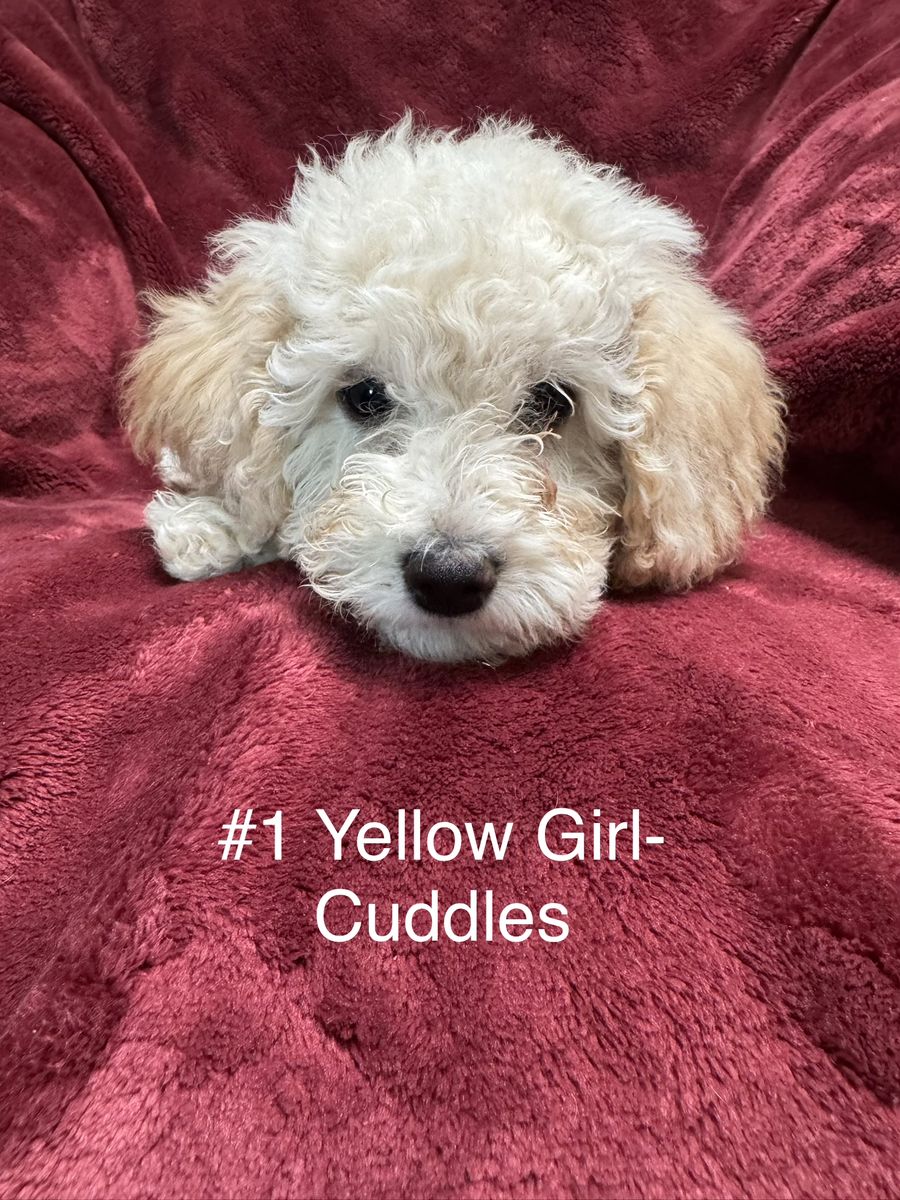 #1 Yellow Girl- Cuddles. White with touches of cream and tan ears-curly coat. 4lbs at 10 weeks. Zippy personality, playful and loves to run. Looks like her momma.