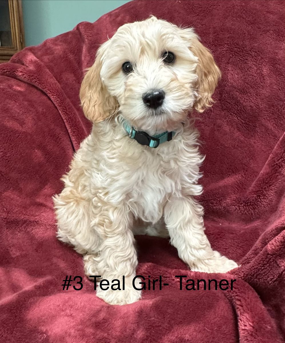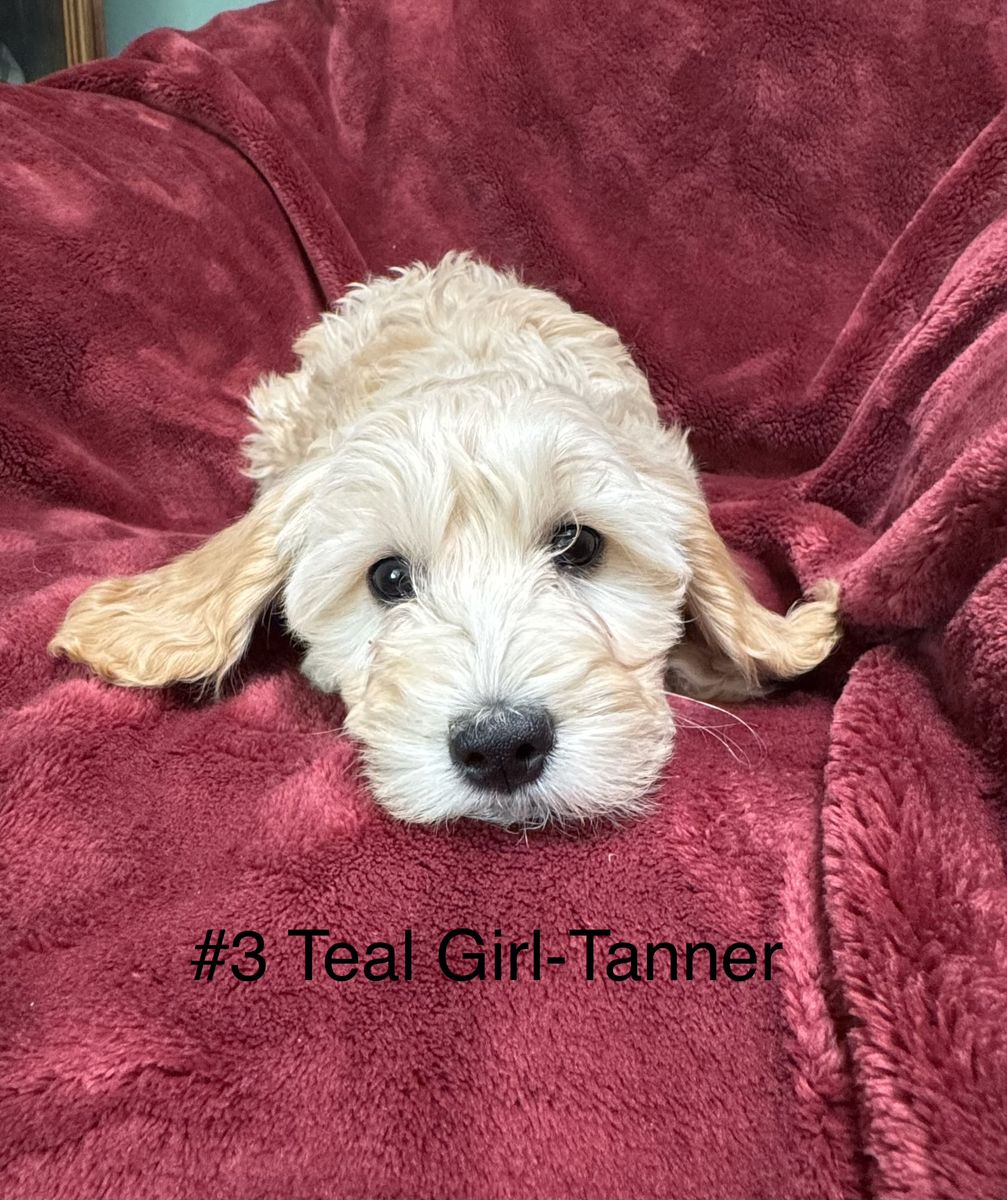 #3 Teal Girl- Tanner. A darker tan and cream beautiful soft, smooth, wavy coat with dark ears. 4.8lbs at 10 weeks. Tenderhearted girl with a quiet shy independence.
