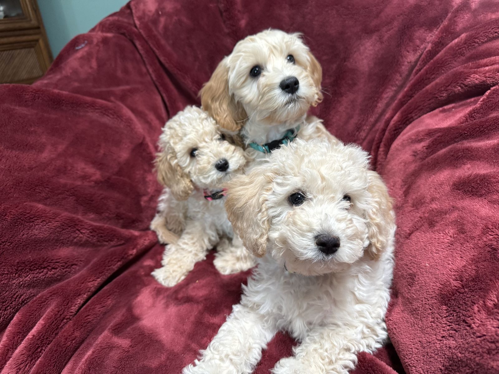 Three female puppies ready for their forever homes. Puppies have been raised in a private home and is the first liter for the Momma, a 13lb Micro DoubleDoodle and Dad, a 15lb GoldenDoodle. They are well behaved, loyal and affectionate. They have been socialized in a family setting alongside other adults and pets. The puppies are progressing with potty training at 10weeks old on March 14. Full grown size would be 13-18lbs-non shedding hypoallergenic.