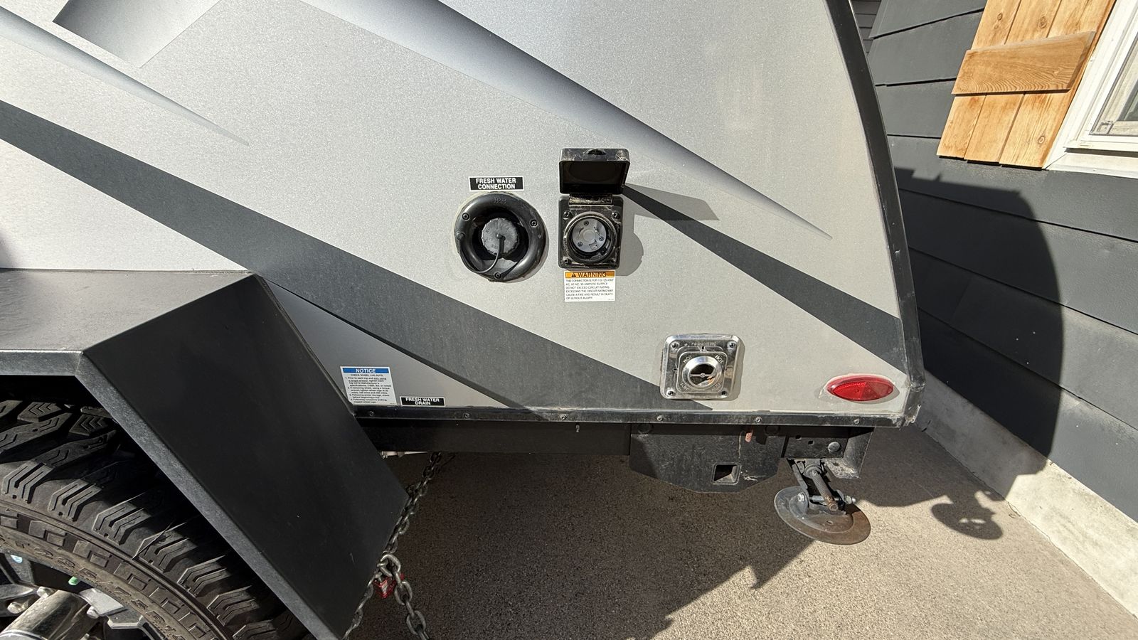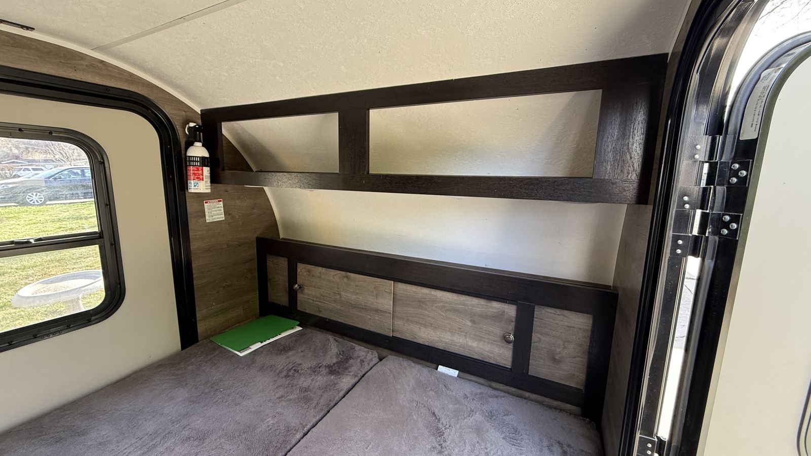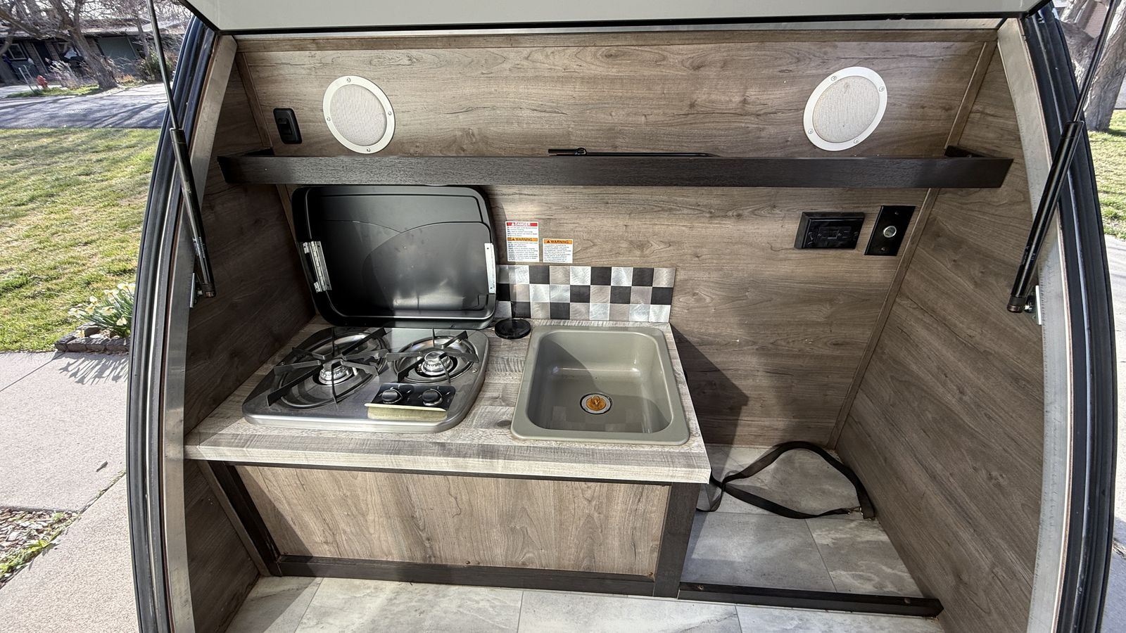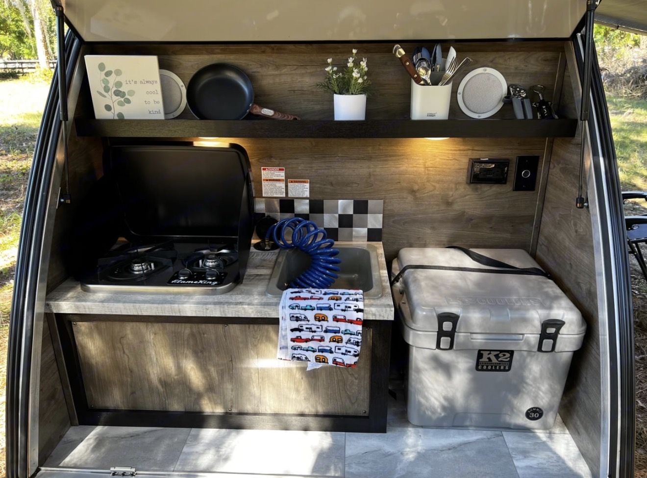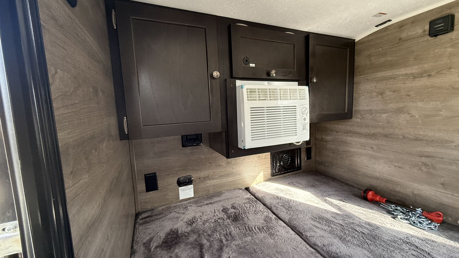 Electrical hookup ready 10 gal fresh water tank 5,000 BTU A/C 12,000 BTU Furnace 2-burner stove Fridge hookup ready Queen bed Bluetooth stereo with interior and exterior speakers 6ft awning Roof rack