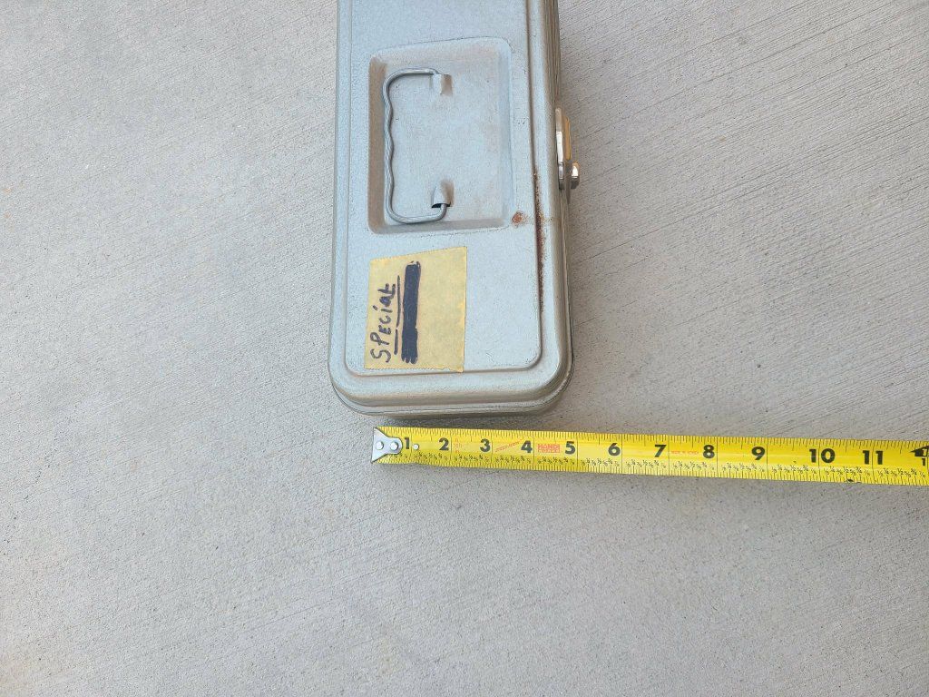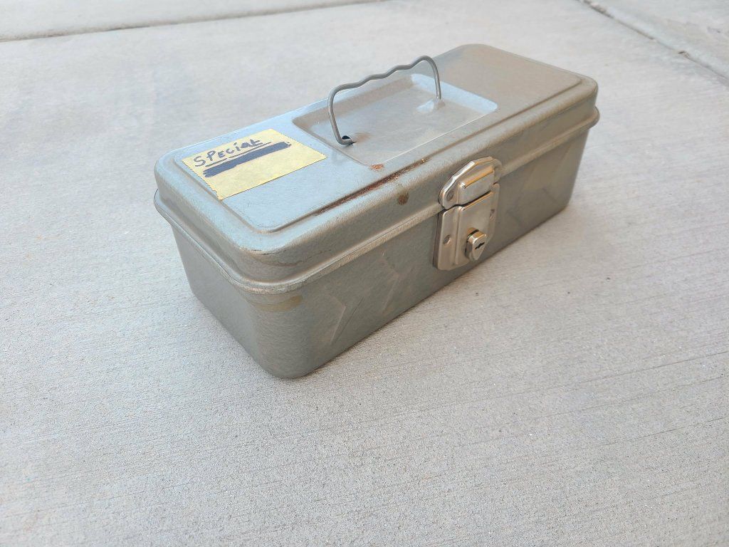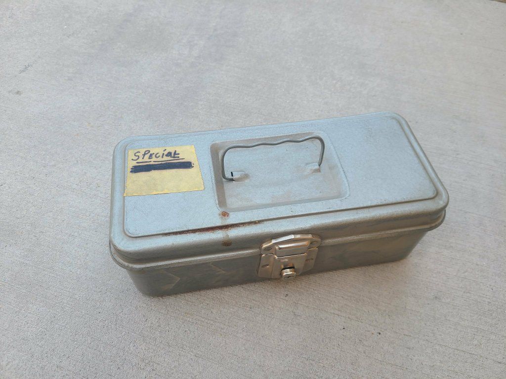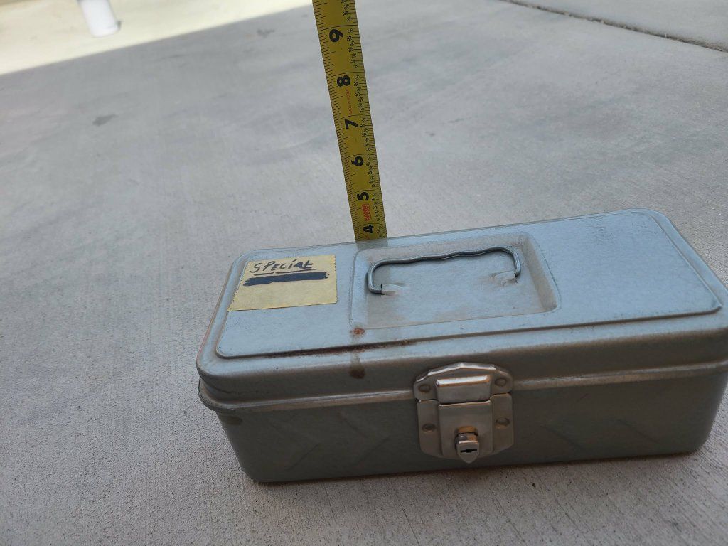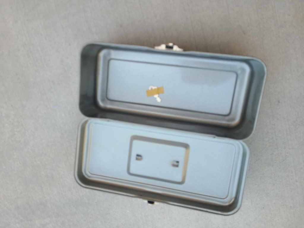 Vintage metal tool box with handle and key
