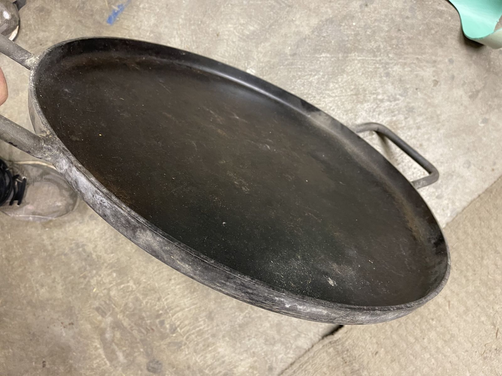 Cast heavy steel skillet with large handles. Perfect for large outdoor cooking groups
