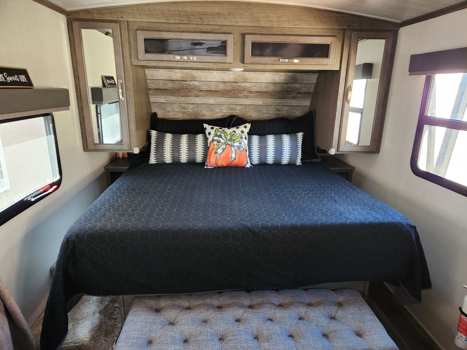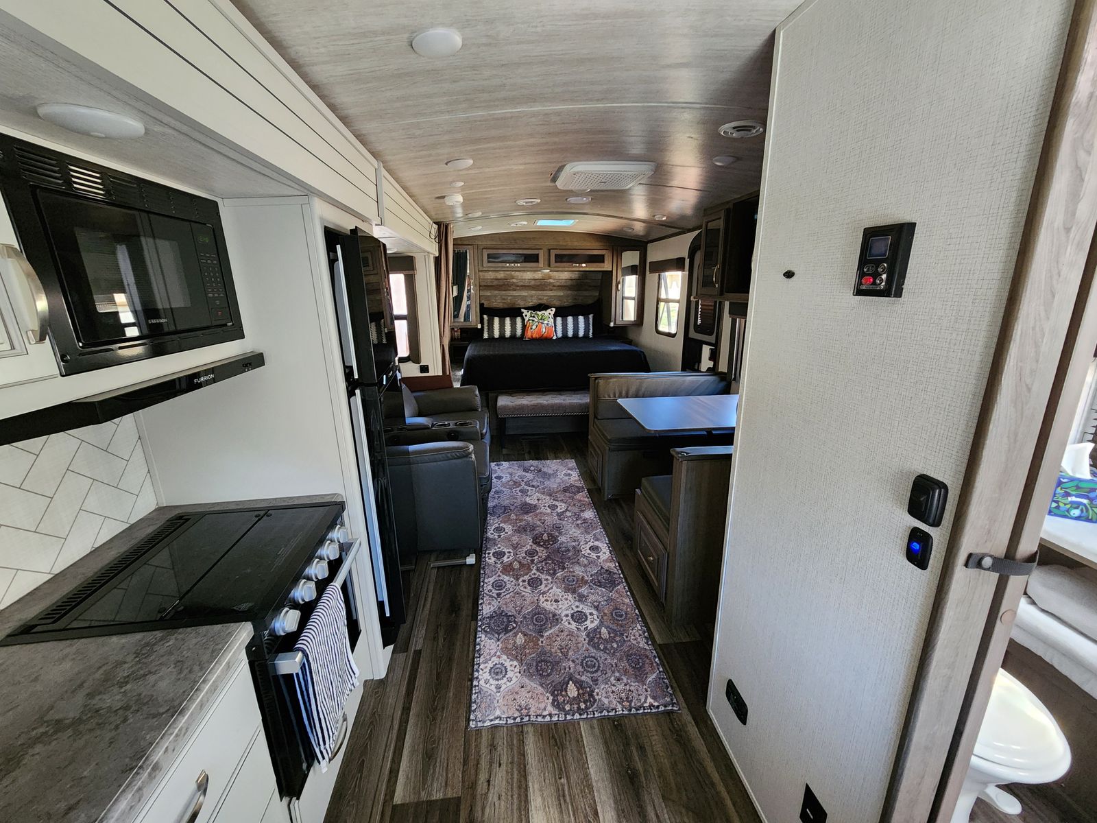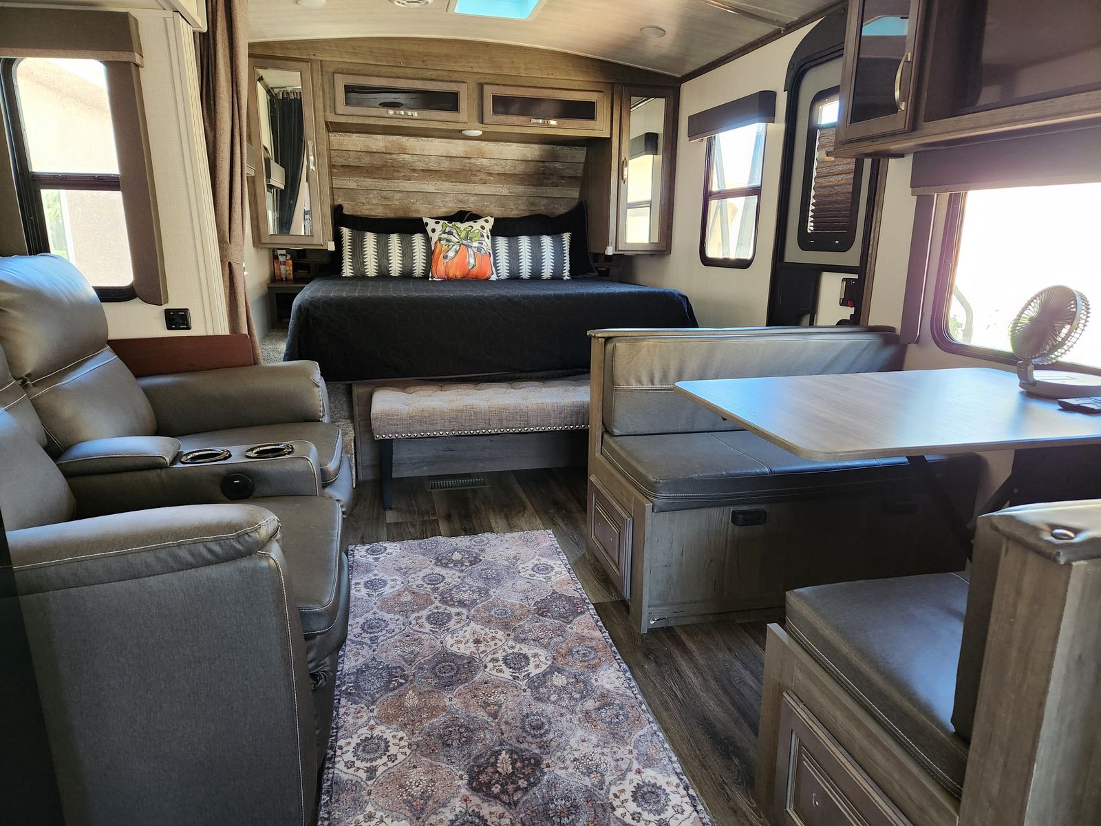 Features include a rear kitchen, 70"x80" king bed with 12" Brooklyn Bedding mattress, theater seating, 40" TV, 12V fridge, 200 W solar, and a tankless water heater. We have highly maintained this RV and is turn-key ready.