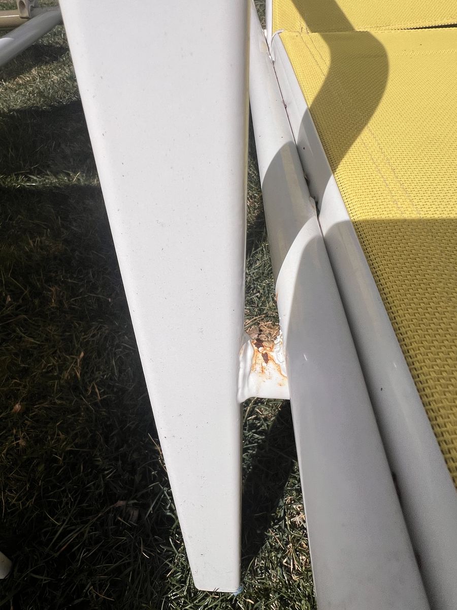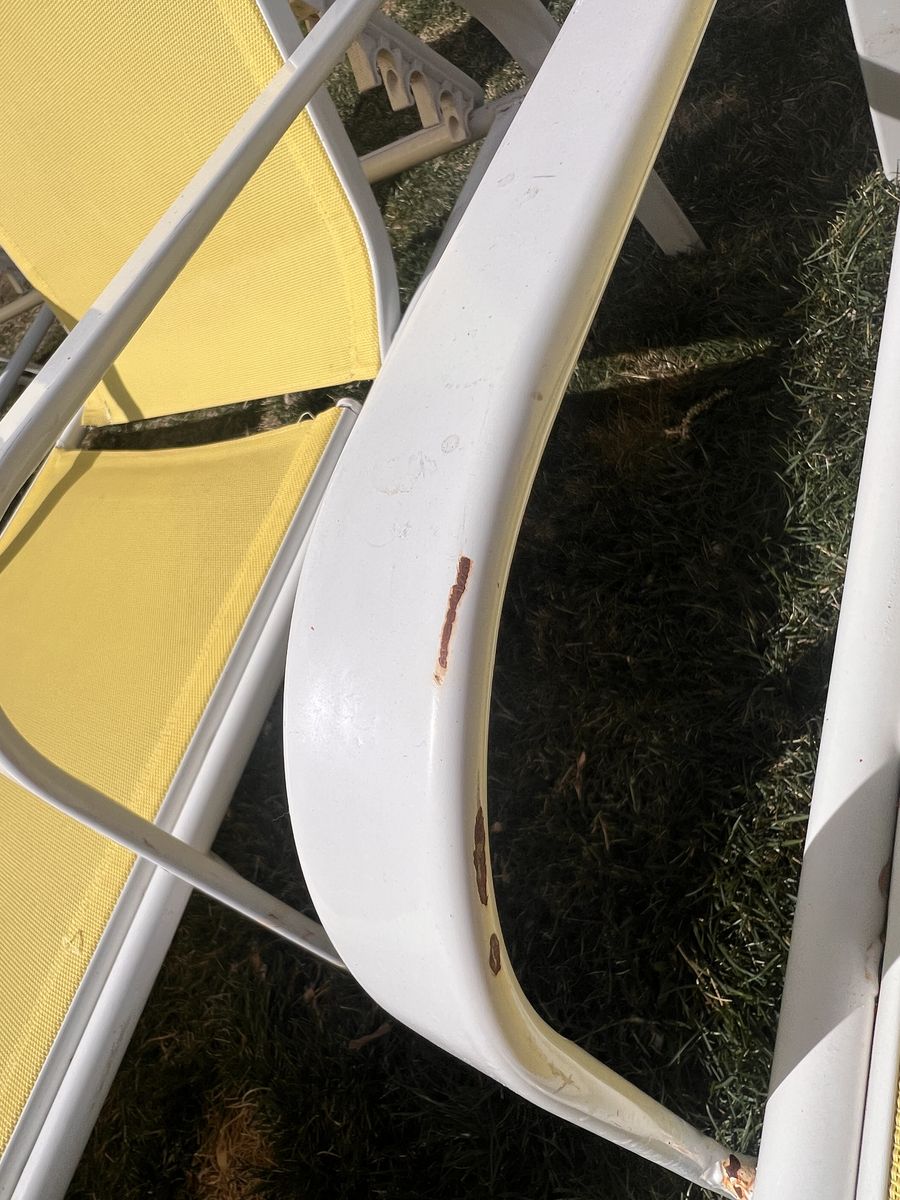 (2) of the chairs are a little lighter in color due to sun and there are small areas of rust. They are sturdy, comfortable outdoor lounge chairs.