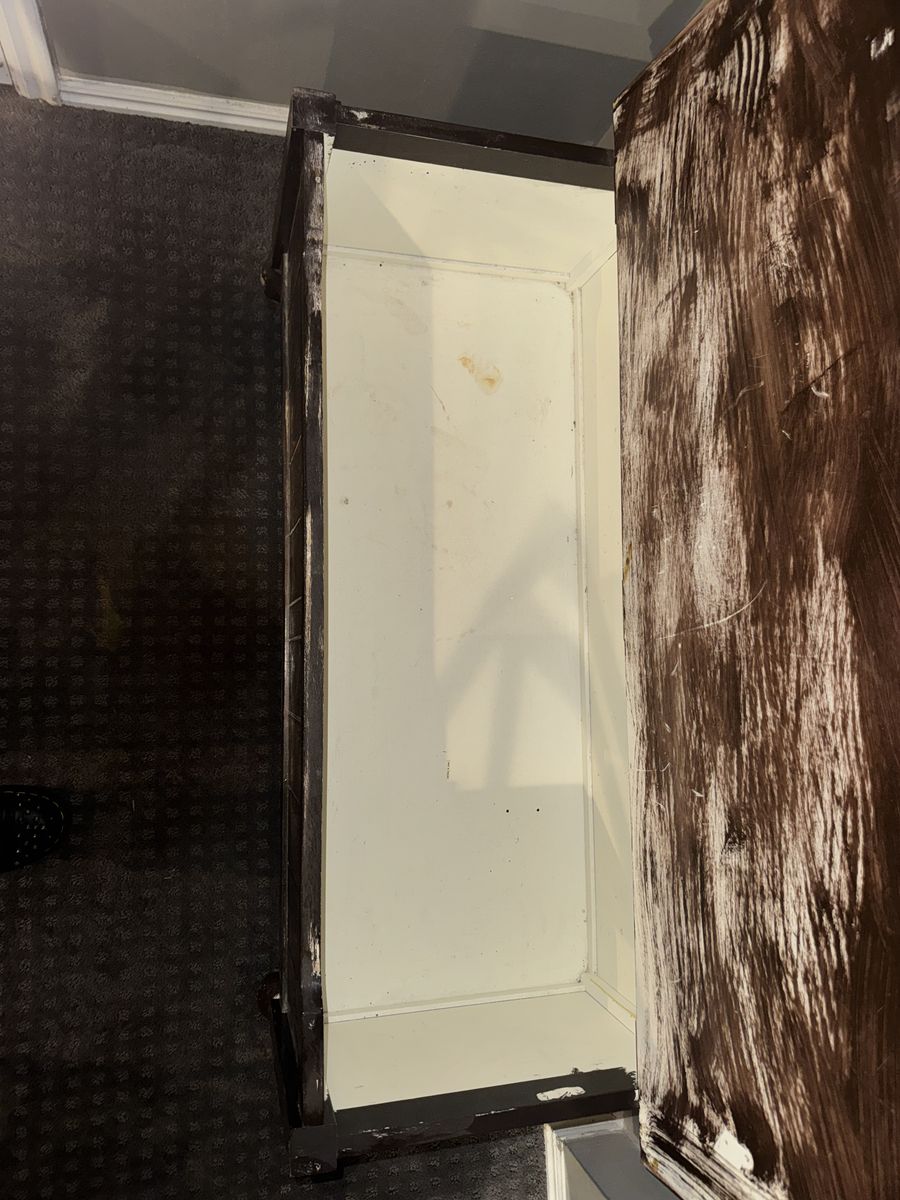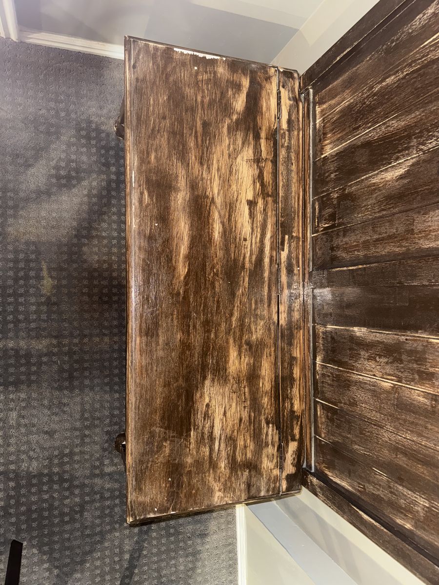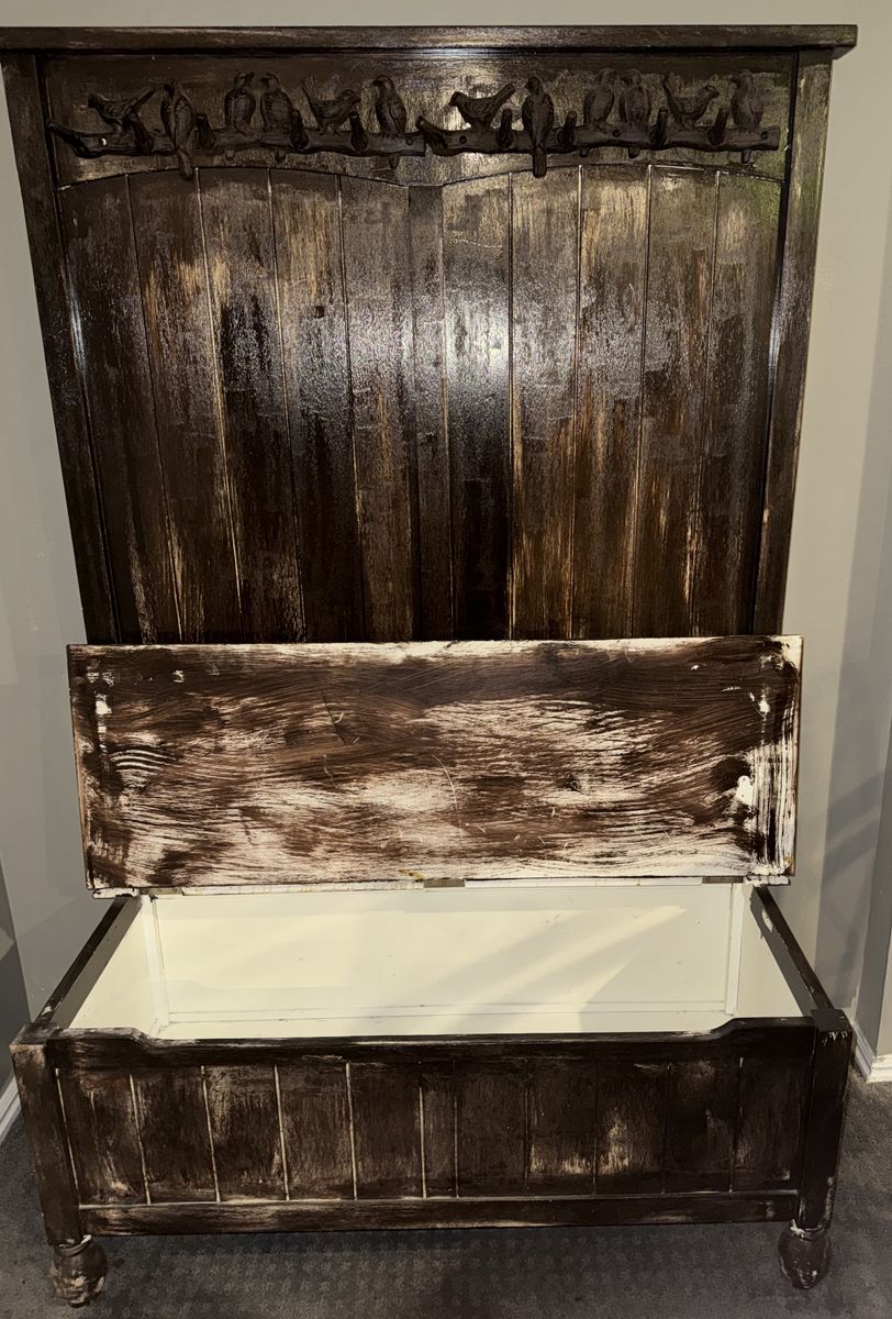 VenmoCoat rack bench with storage. Worn look with some small damage. The whole thing is 43x19x63 with the bench storage being 43x19x19.