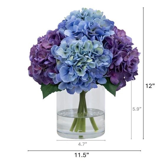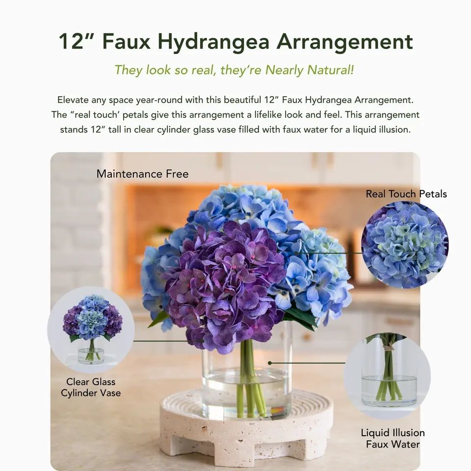 Elevate any space year-round with this beautiful 12" Faux Hydrangea Arrangement. The " real touch" petals give this arrangement a lifelike look and feel. This arrangement stands, 12" tall in clear cylinder glass vase filled with faux water for a liquid illusion