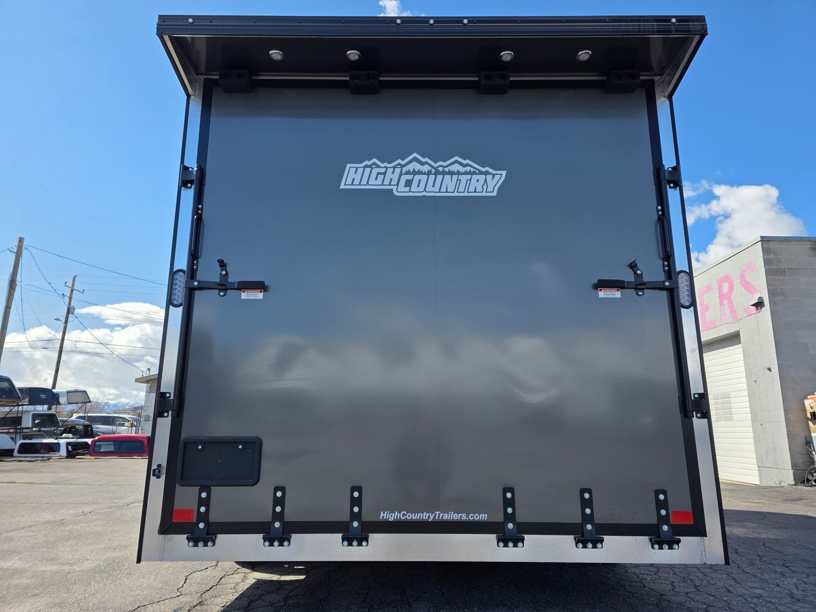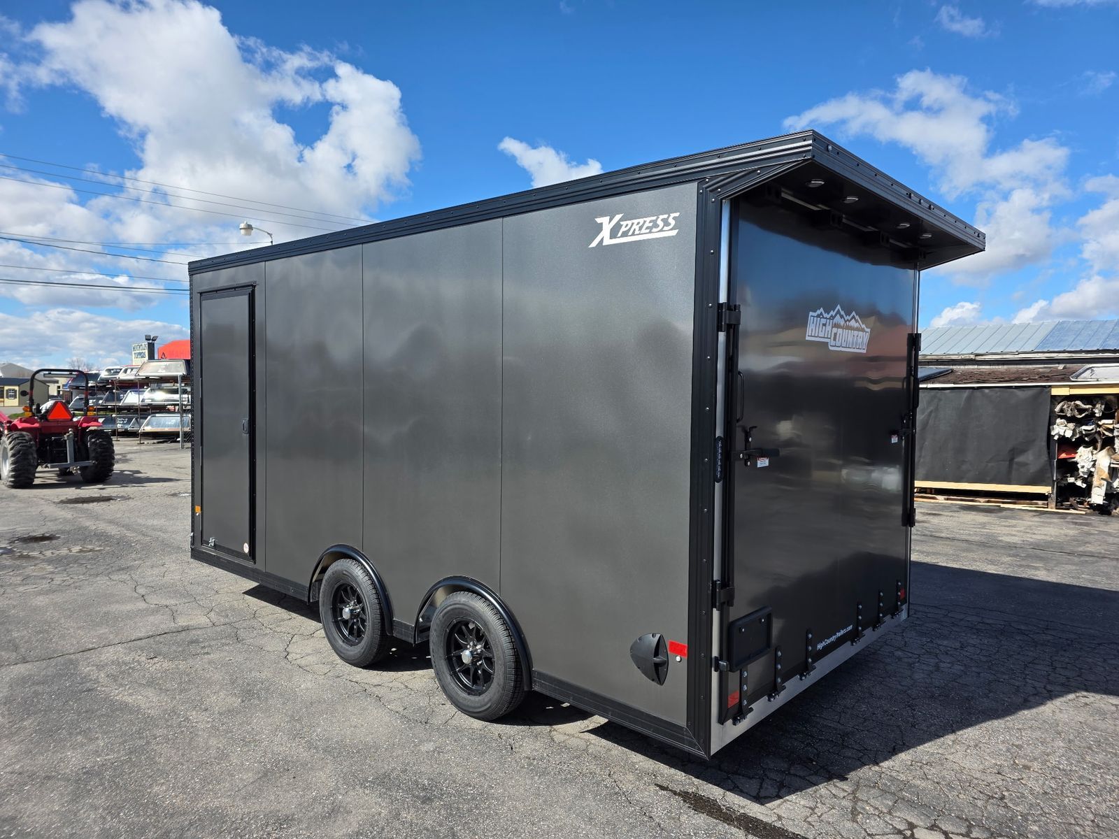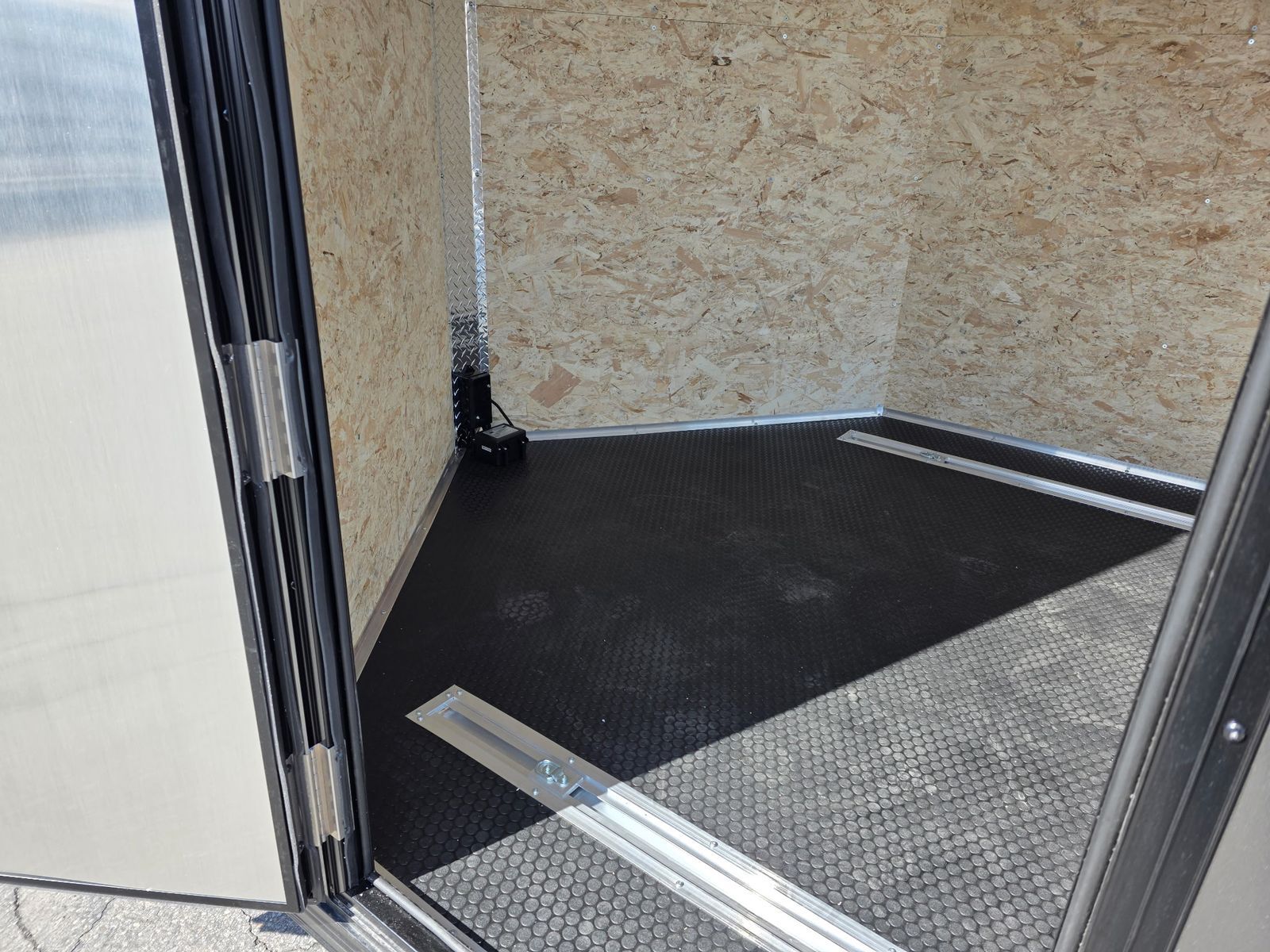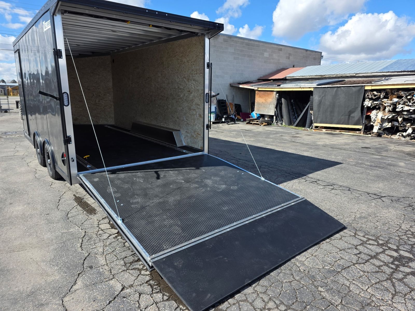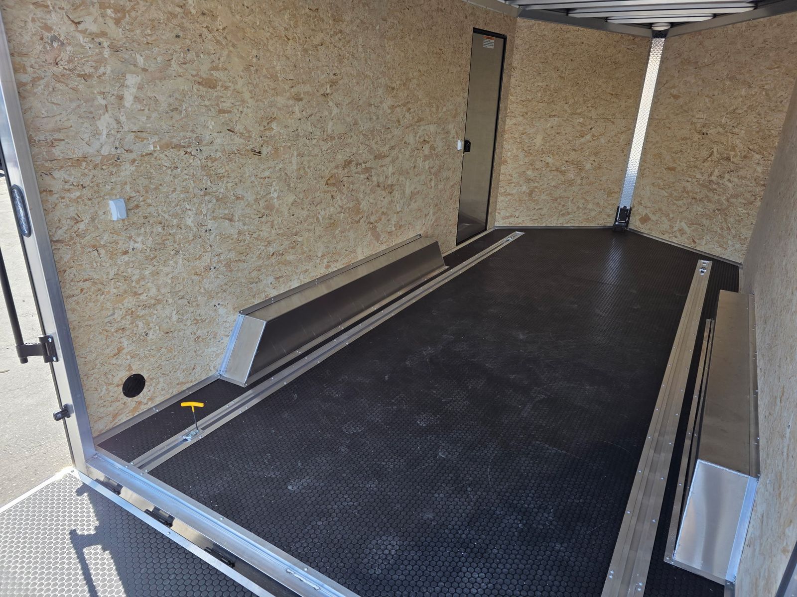 7.5FT INTERIOR AND REAR RAMP DOOR WITH 7X7.5FT REAR DOOR OPENING WITH SPRING ASSIST - SLOPED V-NOSE - GVWR 7000 - 2 ROWS OF SLICK TRACK WITH 4 SLIDING D-RINGS - 32"X78" SIDE ACCESS DOOR - 080 SKIN - INTERIOR DOME LIGHTS WITH SWITCH - EXTERIOR LED LIGHTING - 3/8" WATER RESISTANT INTERIOR WALLS - 3/4" WATER RESISTANT DECKING - TPO RUBBER COIN FLOOR AND RAMP - REAR SPOILER - BLACK ALUMINUM WHEELS UPGRADE - COLOR: CHARCOAL
