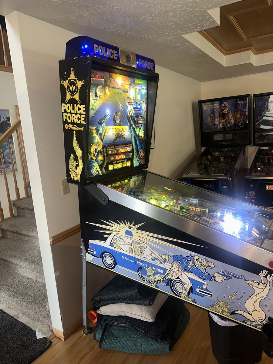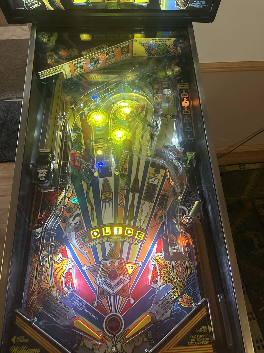 I have totally brought this classic Williams Police Force pinball machine back to 100% working condition. It has been totally converted to LED lights so this set of bulbs should last its lifetime. The playfield is in excellent condition for a machine from 1989! Kids live the police vs animals theme and it's simple but fun ruleset gives everyone a chance. Multiball starting from the police car is always amusing! Come check it out or my other machines too. This one will bring a smile to your face