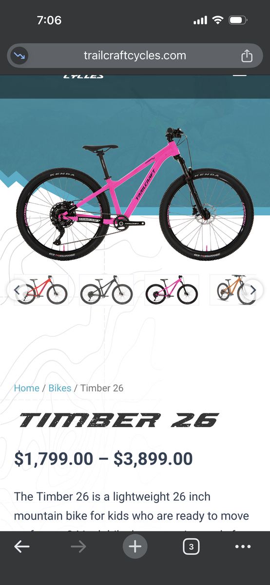 The Timber 26 is a lightweight 26 inch mountain bike for kids who are ready to move up from a 24 inch bike but not quite ready for an adult frame. With new-school geometry, a SUPER low 24″ standover height, and builds starting at just 23 pounds, this bike helps young riders level up their trail skills without the weight or bulk of a full-size adult-bike setup.