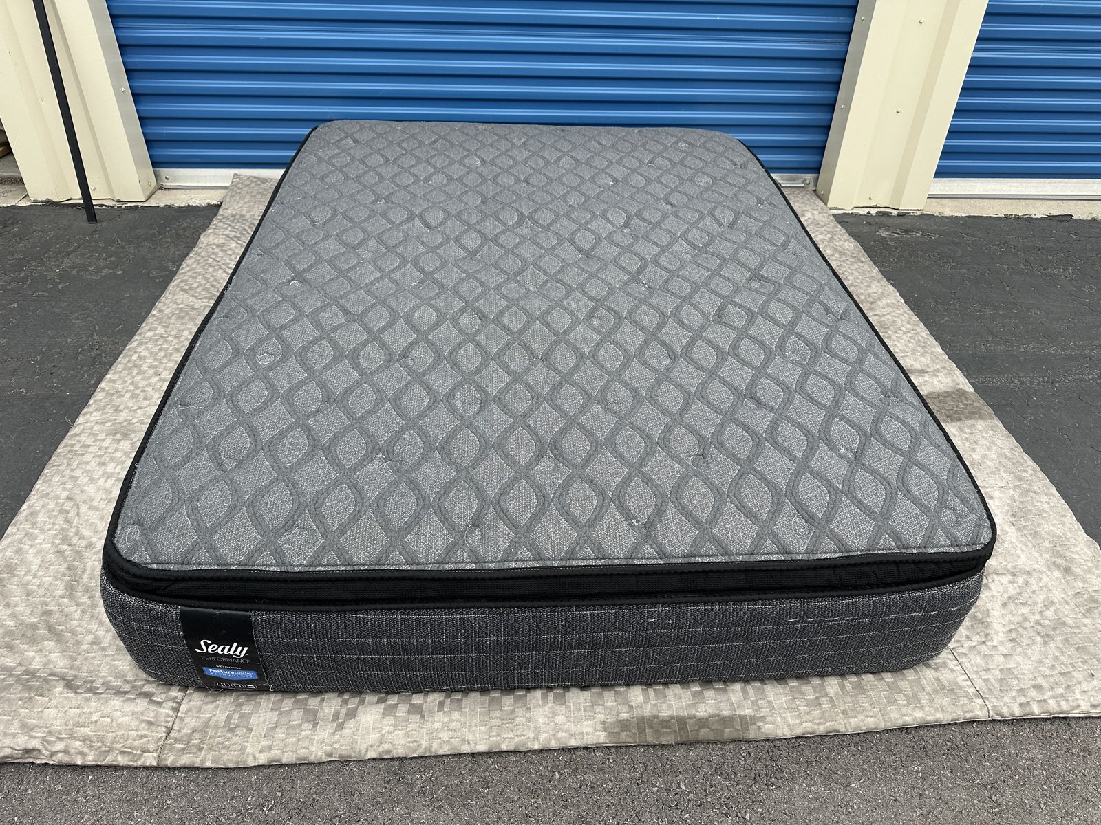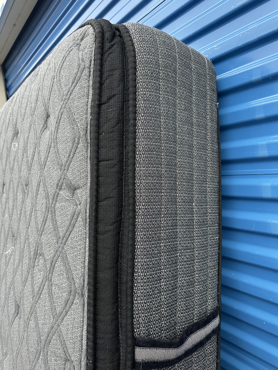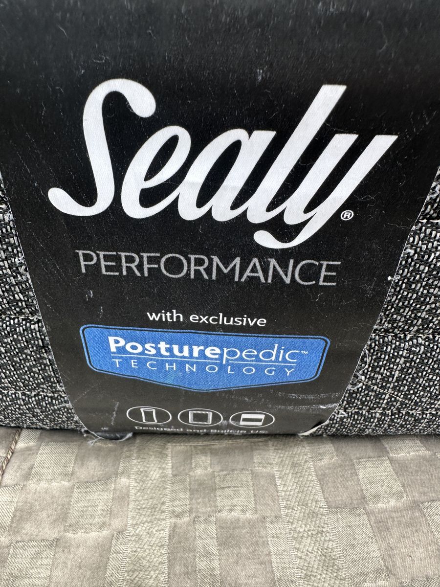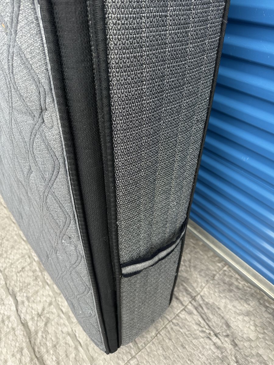 Check out this 14” Sealy Performance Posturepedic queen mattress. Overall, it is in excellent condition. There are some signs of imperfections, some of the fabric by one of the side handles is ripped from moving, some signs of use, etc.