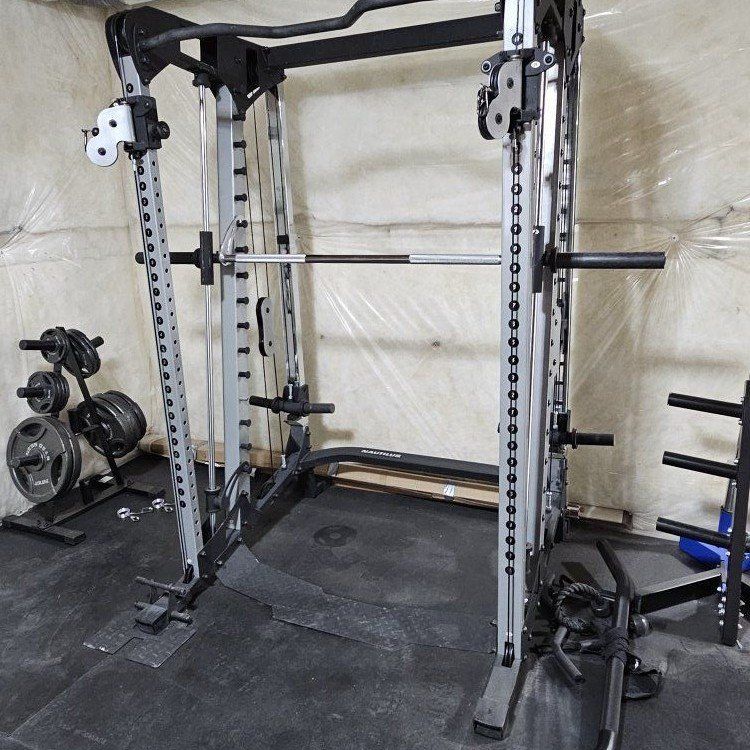 ZelleNautilus NT-CC1 Smith Machine with Cable Crossover with Bench, Leg Curl Extension, Hand Grips, Ankle Cuff, Tricep Rope, Low Row Pull Bar & Lat Pull Bar. 205 lbs of Plates