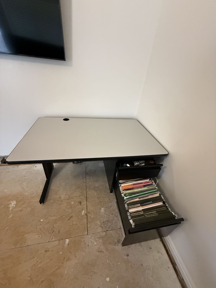 Desk and chair are in perfect condition no scuffs or marks. 2 drawers. Large drawer for files and smaller drawer as well.