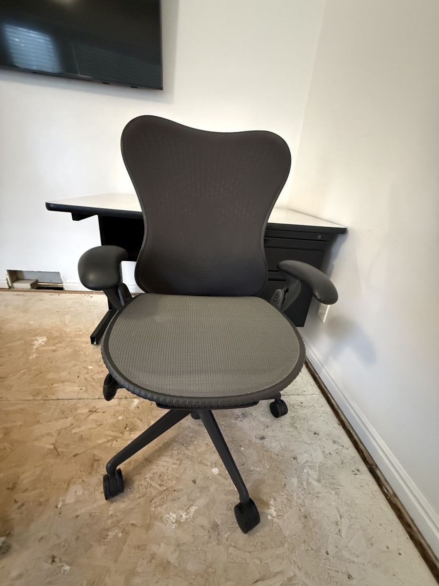 Chair is adjustable, seat and back are a breathable mesh material and free of stains or tears. Works perfectly.