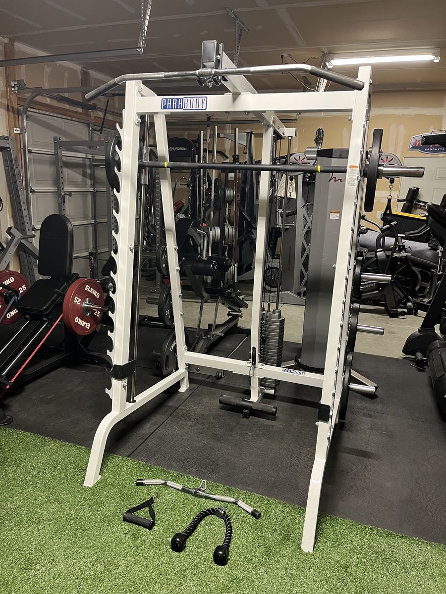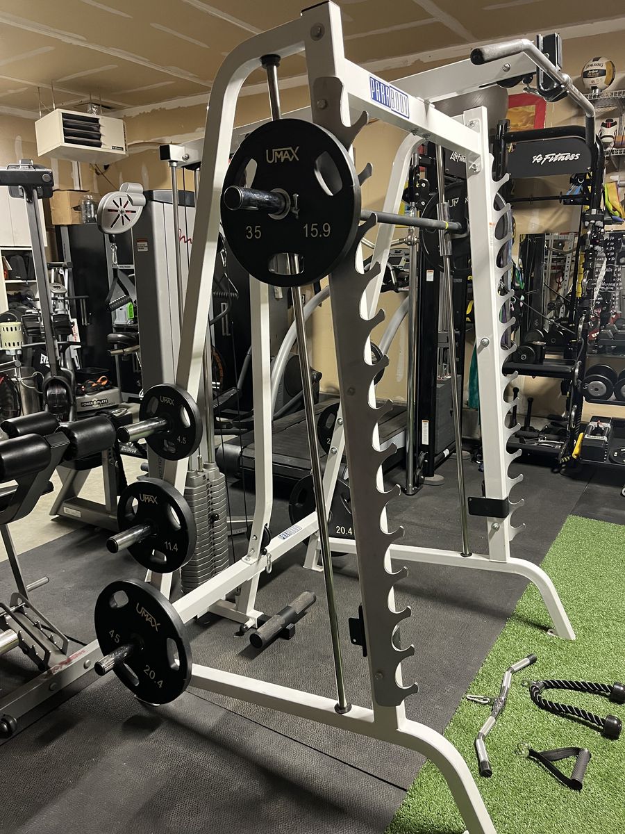 Commercial quality Olympic Smith machine complete home gym set up in new condition!! The Smith machine has linear bearings making it incredibly smooth and has a gun rack racking system making it very convenient when free lifting the rack also has an upper and lower pulley system with a 210 pound Weight stack. The pulley system is silky smooth and comes with several different pulley attachments. Comes with a commercial UMAX urethane Olympic grip weight set. New this rack with the pulley system would cost almost $3000 and new the weight set cost $1000 selling for everything altogether for $1800 FIRM! Curbside delivery is also available for gas money.