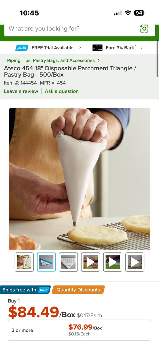 Description: Brand new box of Ateco Large Parchment Triangles (18”). Perfect for baking, decorating, and piping icing, chocolate, or sauces. These disposable parchment triangles make it easy to create pastry bags quickly and keep your kitchen clean.