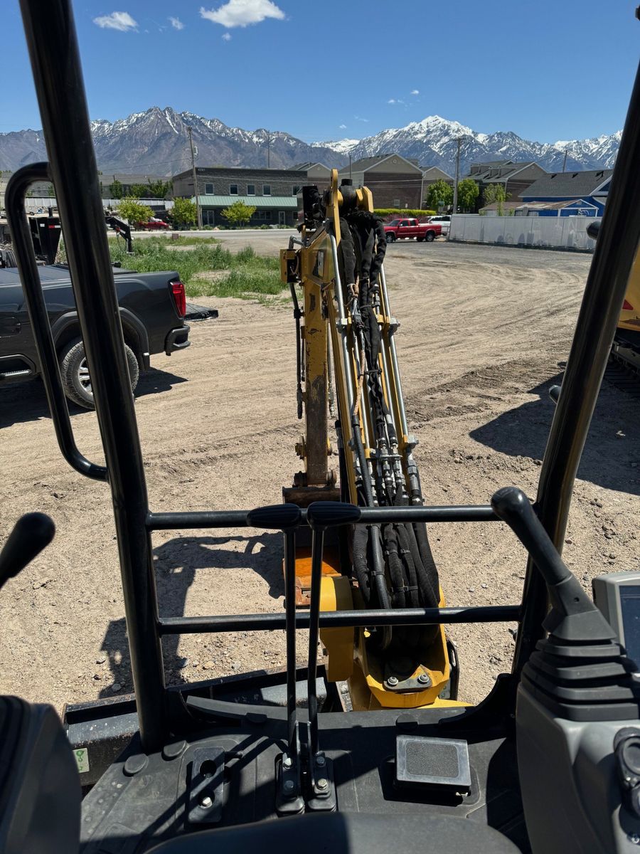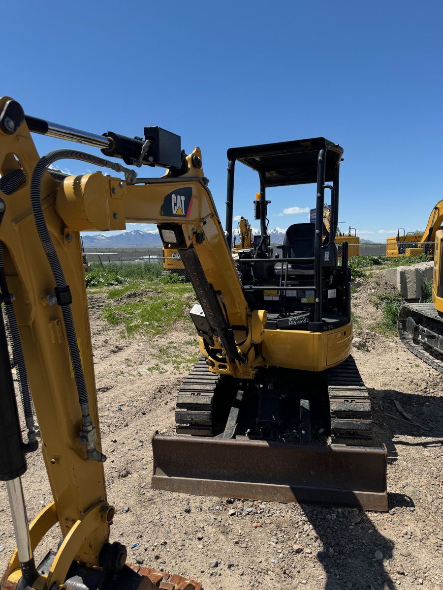 CAT 303E CR mini excavator for sale. 1,600 hours. Comes with auxiliary hydraulic plumbing and rubber bolt-on pads. Open canopy with ROPS, front blade. Machine is in good working condition.