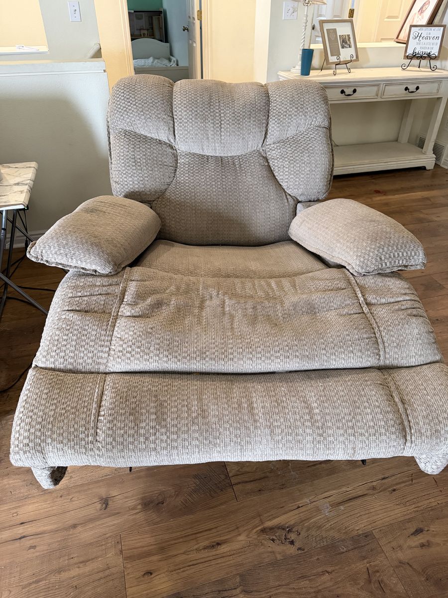 Selling our recliner! It is very comfortable and rocks so nice! It reclines back easy and smooth with no issues. Could use a little cleaning, but overall in great shape!