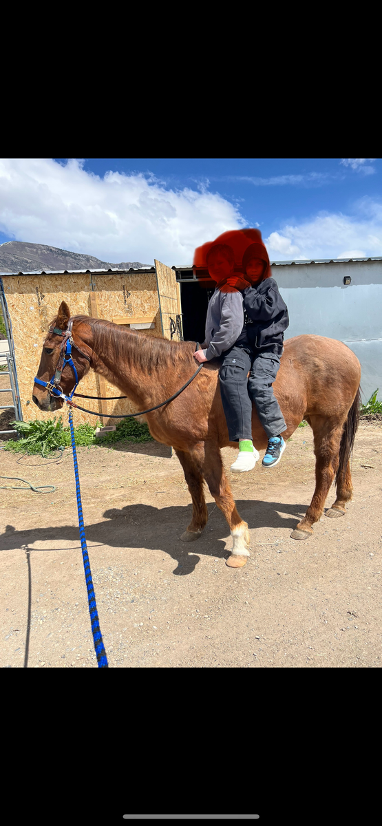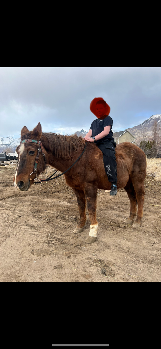 This is Buddy! He's 20 years old and as sweet as can be. Everyone in the family rides him because he is safe... Kids to husband. He totes around beginners and is super calm. He can be ridden bareback or saddle. No buck, bite or skittish behavior. He's just a good ol boy. He is used for light riding and does great. He does keep good weight on hay but does love pellets also. He had his teeth floated last summer. He is current on deworming and hoof trimming. It breaks my heart to re home him because he is very loved but I'm moving out of state. Excellent home is a must!