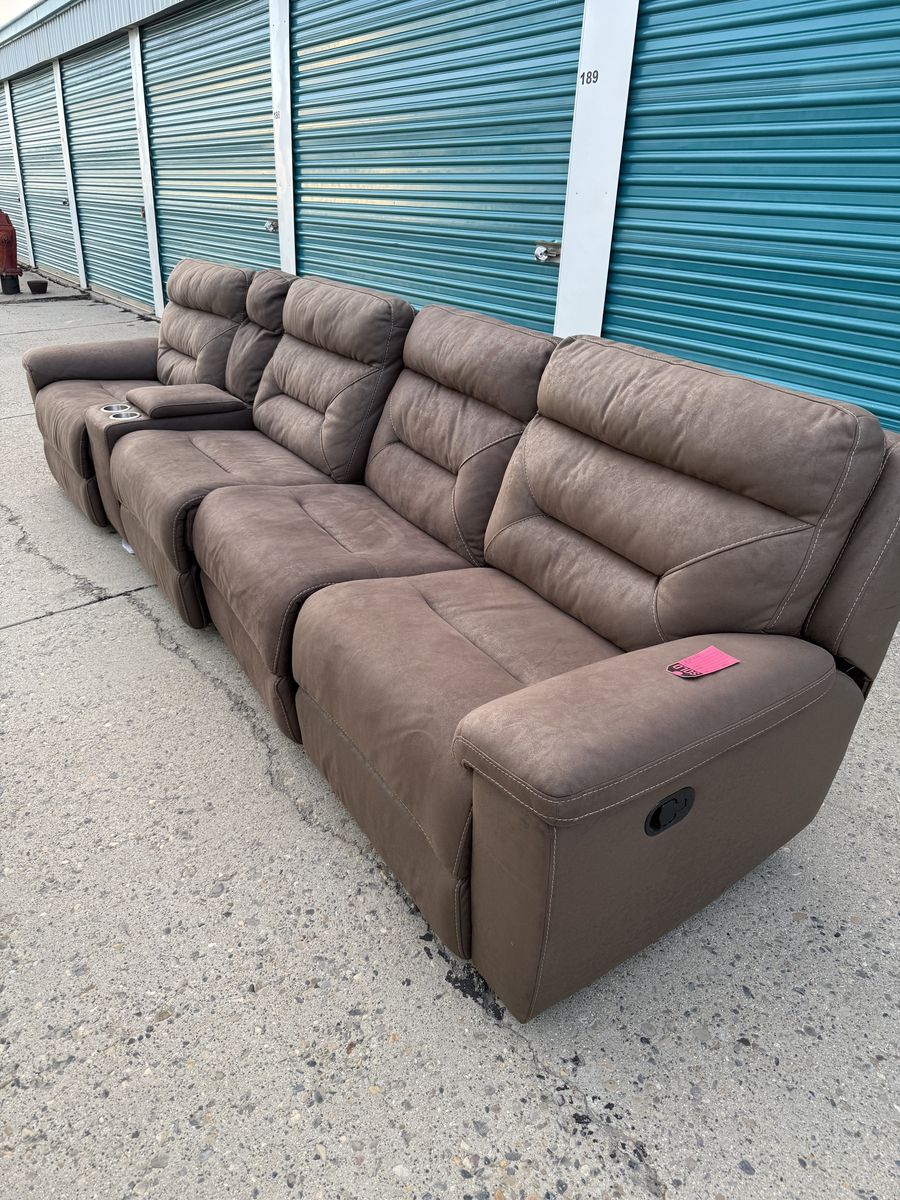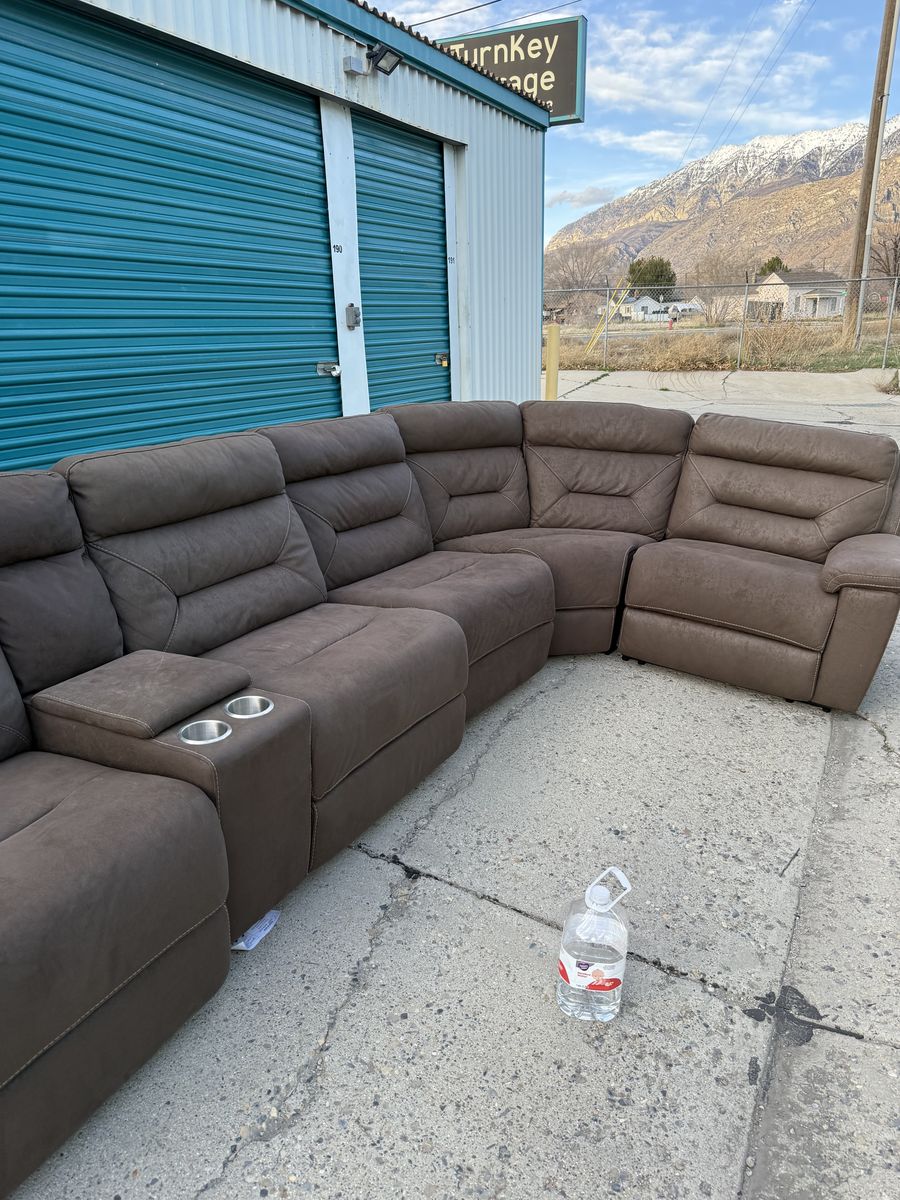 VenmoLarge brown sectional couch. Both ends recline. There is a middle compartment and 2 cup holders. Comes in 5 pieces. This is still brand new. We bought it for our house but we ended up changing plans. 12ft x 6ft