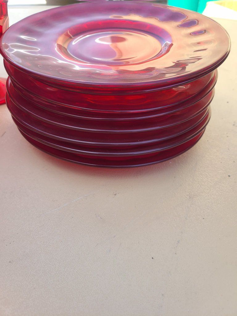 Comes with 8 matching plates, a single pepper shaker, and a large salad or serving bowl.